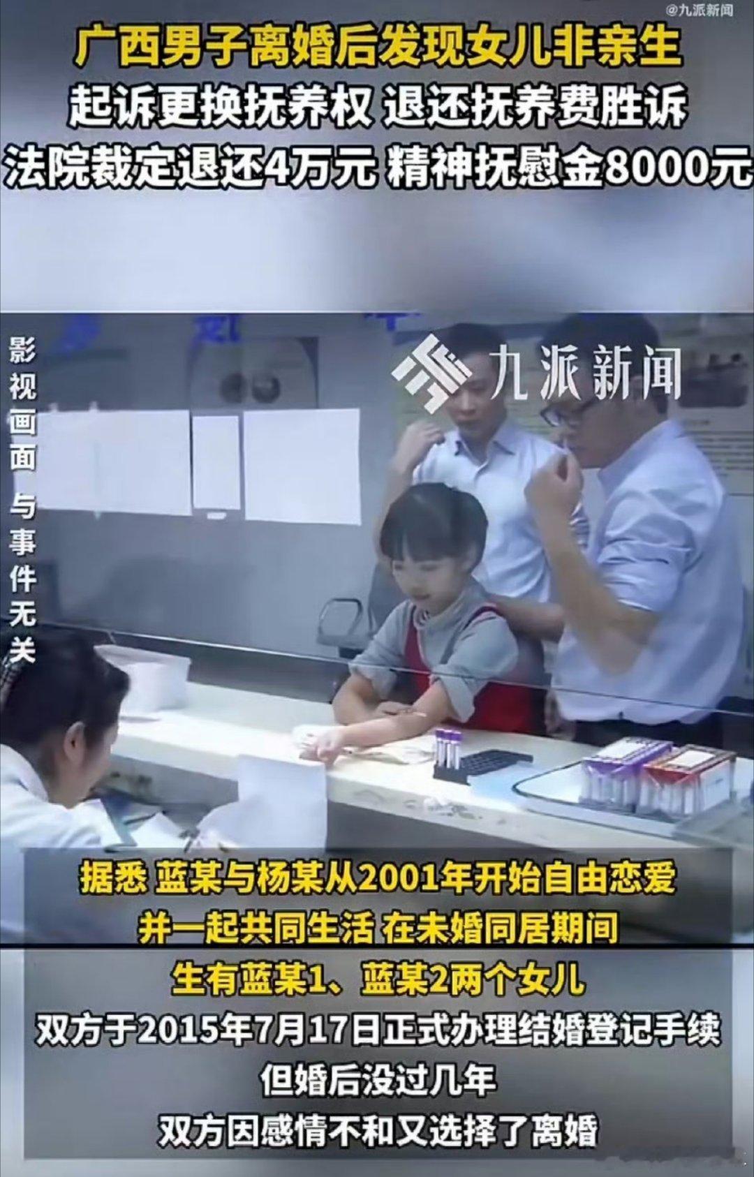 广西贵港一男子离婚后发现女儿非亲生,起诉更换抚养权,退还抚养费并要求精神损失赔偿,法院:被告返还抚养费4万,支付精神损害抚慰金8千。