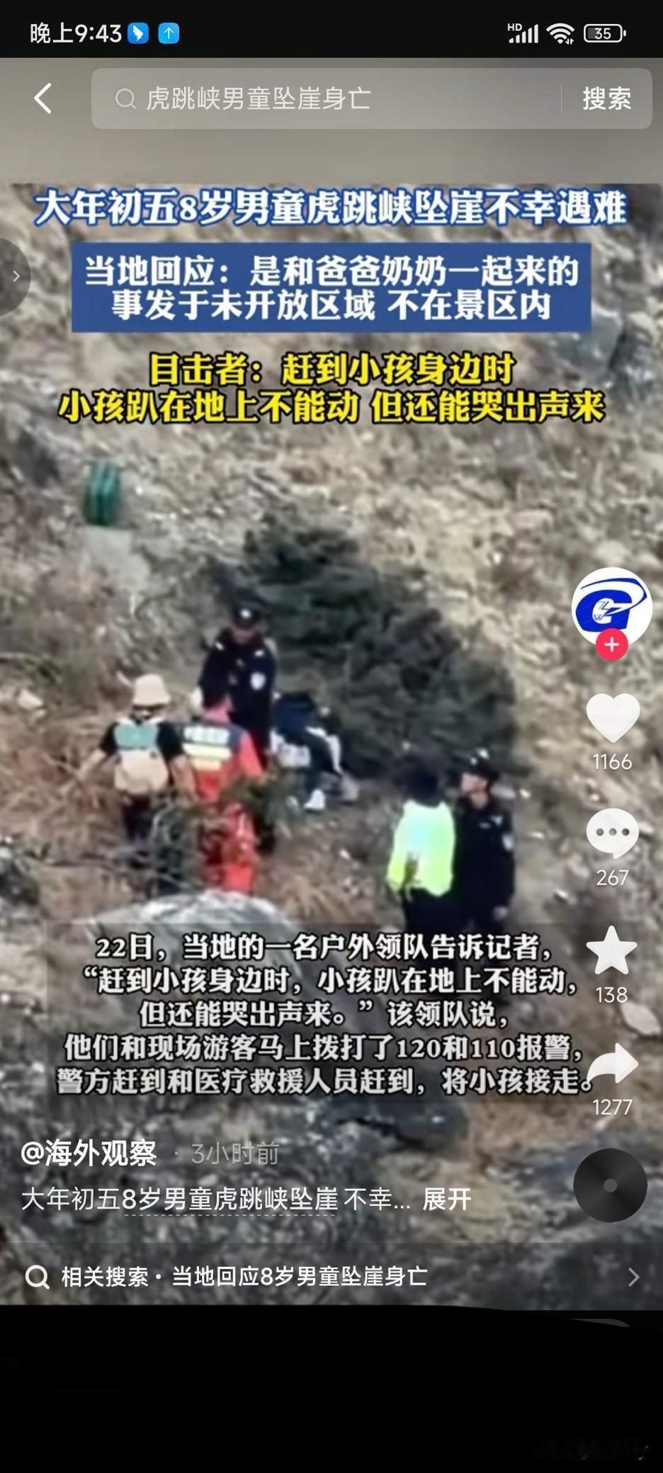 虎跳峡最窄的地方,仅能容纳一个人通过!看着腿都发软! 如果对面来个人,一方就得侧着身对面的人才能过去!这么危险的地方,当天又刮着大风,一个8岁的孩子父亲为什么没牵着他的手让孩子走在自己的最里侧! 一同前往虎跳峡游玩的网友觉的小朋友很可爱,还拍下了这一家三口的视频,爸爸走在最前边,男孩蹦蹦跳跳地走在中间,奶奶背着包拿着登山杖走在最后边!看来奶奶也经常登山! 原本充满欢声笑语的祖孙三代出游却戛然而止!春节的喜庆氛围被彻底击碎了!老人也因突如其来的打击悲痛欲绝,整个家庭被无尽的悲伤笼罩着! 人类永远要懂得敬畏大自然!通过这个悲剧,希望大家引以为戒:带孩子出去玩要有十足的责任心,不要带他们去危险的地方玩耍!一次意外将后悔终生!