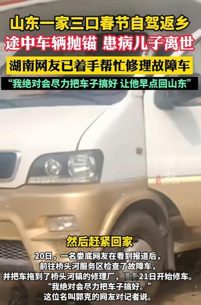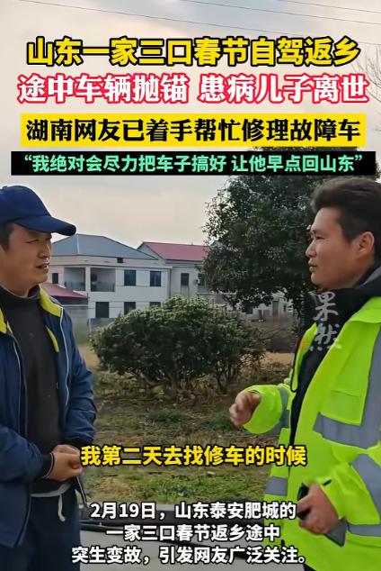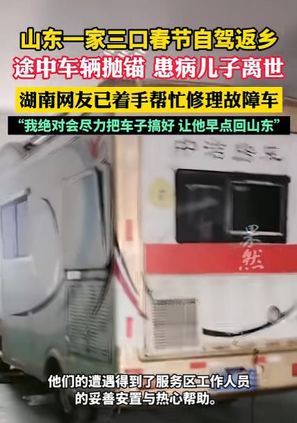 2026年2月20日发布,湖南,一男子带着偏瘫妻子和患病儿子开车返乡过年,途经高速服务区时车子突然抛锚。他正联系工人修车,没想到儿子旧疾突发离世!男子又伤心又慌乱,服务区员工立刻赶来帮扶。他哽咽着含泪道谢,还说:“只想把车修好,回家处理儿子后事。” 2026 年的春运大潮里,每一辆疾驰在高速上的车,都装着一家人盼了一整年的团圆。腊月廿八这天,山东泰安的朱磊握着方向盘,目光紧紧盯着前方的路面,他的车里载着最牵挂的两个人,一路从广西出发,要赶在春节前回到老家。 朱磊的日子过得并不轻松,妻子早年突发脑出血,抢救回来后落下了半身不遂的毛病,生活完全无法自理,吃饭、翻身、简单挪动,每一件小事都要靠他贴身照料。 身边的儿子刚满十九岁,本该是朝气蓬勃的年纪,却被进行性肌营养不良缠了多年,身体一直虚弱不堪。 可孩子格外懂事,平日里会帮着父亲用手机查路线、找驻车点、搜附近的便民设施,一句 “儿子,帮爸看下路线”,成了父子俩长途出行里最常有的对话,也成了朱磊疲惫路上的一点小依靠。 为了让家人的身体能得到更好调养,朱磊带着妻儿在广西待了一阵子,眼看年关越来越近,他一心想带家人回老家和亲人团聚,便收拾好简单的行李,踏上了自驾返乡的路。 一路奔波,车子驶入湖南境内,春运的车流依旧密集,朱磊不敢有半点松懈,一边留意着复杂的路况,一边时不时回头看一眼后座的妻子和儿子,生怕他们有半点不舒服。 谁曾想行驶到途中的时候,车子却突然抛锚到了异乡的高速服务区,朱磊的心一下子揪紧,他最怕耽误行程,更怕身边行动不便的家人跟着遭罪。 他赶紧掏出手机,四处联系维修车辆的师傅,心里只盼着能有人尽快赶来,把车修好,让这段归途能继续往前走。 可命运的残酷,总在人最无助的时候接踵而至。就在他站在车旁焦急打电话的间隙,车里的儿子突然旧疾急性发作,脸色瞬间惨白,呼吸也变得异常急促。 朱磊挂掉电话冲回车内,看着儿子痛苦的模样,整个人都慌了神,手忙脚乱却又无从下手。 服务区工作人员发现异常后,第一时间帮忙拨打 120,急救人员火速赶到现场全力抢救,可遗憾的是,所有努力都没能留住这个年轻的生命,儿子还是在这片陌生的土地上,永远离开了他。 那一刻,朱磊像是被抽走了所有力气,瘫坐在车边,眼泪不受控制地往下掉,一边是生活不能自理的偏瘫妻子,需要他寸步不离照料。 一边是刚刚离世的儿子,让他陷入撕心裂肺的悲痛;还有抛锚在原地的车子,彻底阻断了他回家的路。 三重打击压得他喘不过气,他陷入深深的慌乱与绝望,脑子里只有一个念头,就是赶紧修好车,回老家给孩子处理后事。 服务区的工作人员能帮忙的都来帮忙了,服务区经理立刻启动应急帮扶,安排专人照看朱磊的妻子,避免她无人照料出现意外,还主动跑前跑后对接后续事宜,帮忙协调各种手续。 员工们自发行动起来,有人从家里带来新鲜蔬菜、鸡蛋和水果,有人凑出爱心捐款,还有人每天按时送来热乎饭菜,免费为他们提供食宿,一遍遍告诉朱磊有任何需要都可以开口,服务区会尽全力帮忙。 这段发生在服务区的故事被发到网上后,很快牵动了全网网友的心。大家都为这个家庭的遭遇惋惜,也被服务区的暖心举动打动。 车辆抛锚始终是朱磊的心头大事,只有修好车,他才能带着妻子尽快返回山东,给儿子料理后事,让孩子早日入土为安。 得知他的心愿后,当地网友和维修师傅主动伸出援手,着手排查车辆故障、寻找适配零件,全力推进维修进度。 负责修车的师傅对着朱磊郑重承诺,一定会拼尽全力把车子修好,绝不耽误他的行程,让他能早点踏上回家的路。 从广西到湖南,再到山东,这段原本装满团圆期待的返乡路,变得满是心酸与坎坷。朱磊一个人扛着家庭重担,照顾着患病的妻儿,本想借着春节圆一场团圆梦,却在异乡遭遇生离死别。 可好在,人间自有温情在,素不相识的服务区员工、不远千里赶来的网友、全力修车的师傅,这些陌生的善意汇聚在一起,像一束束光,照亮了他灰暗的归途。 春运的车流依旧在高速上穿梭,团圆的故事每天都在发生,而朱磊的这段归途,因为一场意外充满悲伤,也因为陌生人的善意变得格外有温度。 对于这件事,您有什么想说的吗?欢迎评论区留言讨论。 信源:齐鲁晚报·果然视频2026-02-21——《山东一家三口春节自驾返乡途中突遇变故,车辆抛锚,患病儿子离世,最新进展:热心网友……》