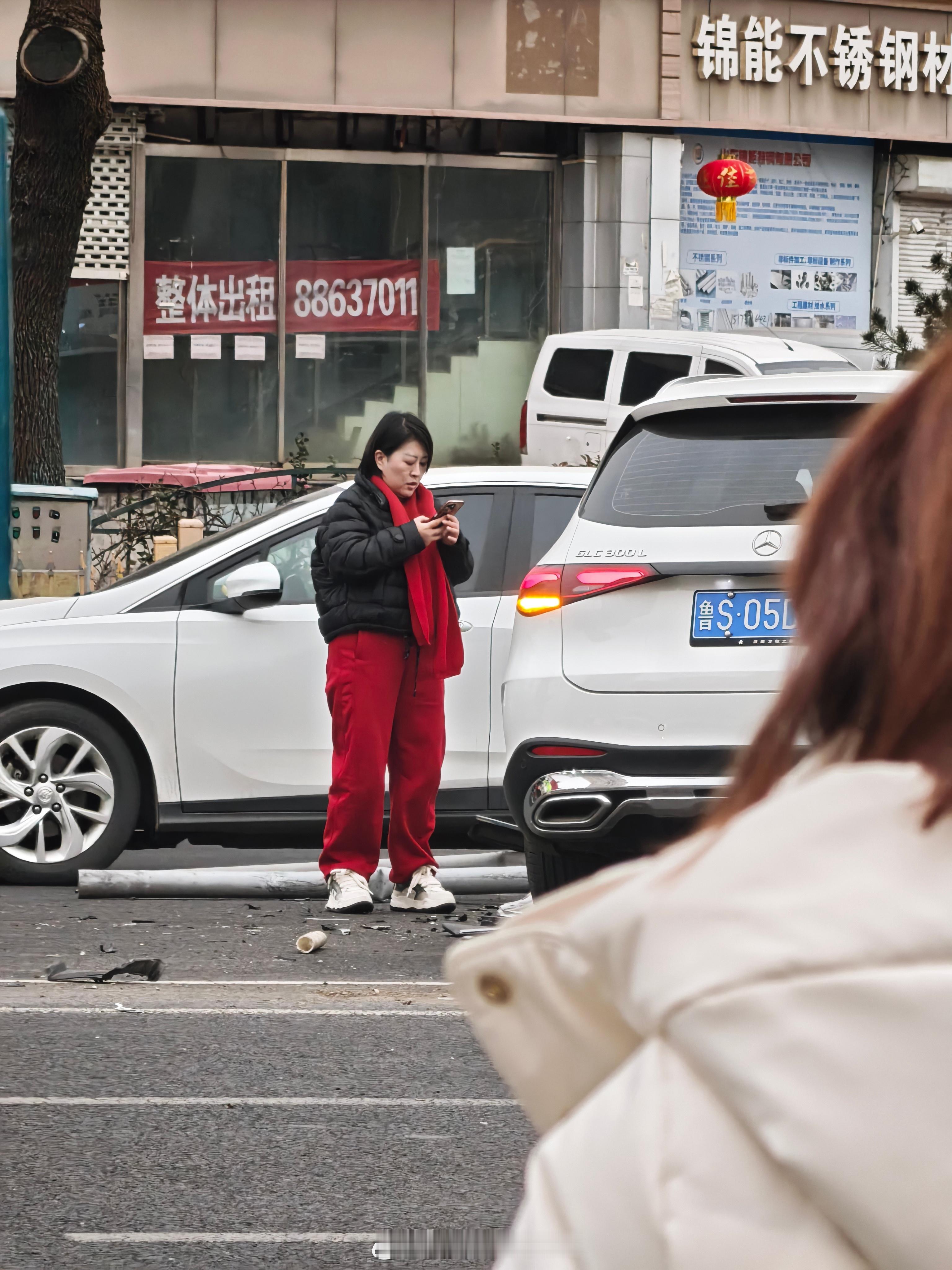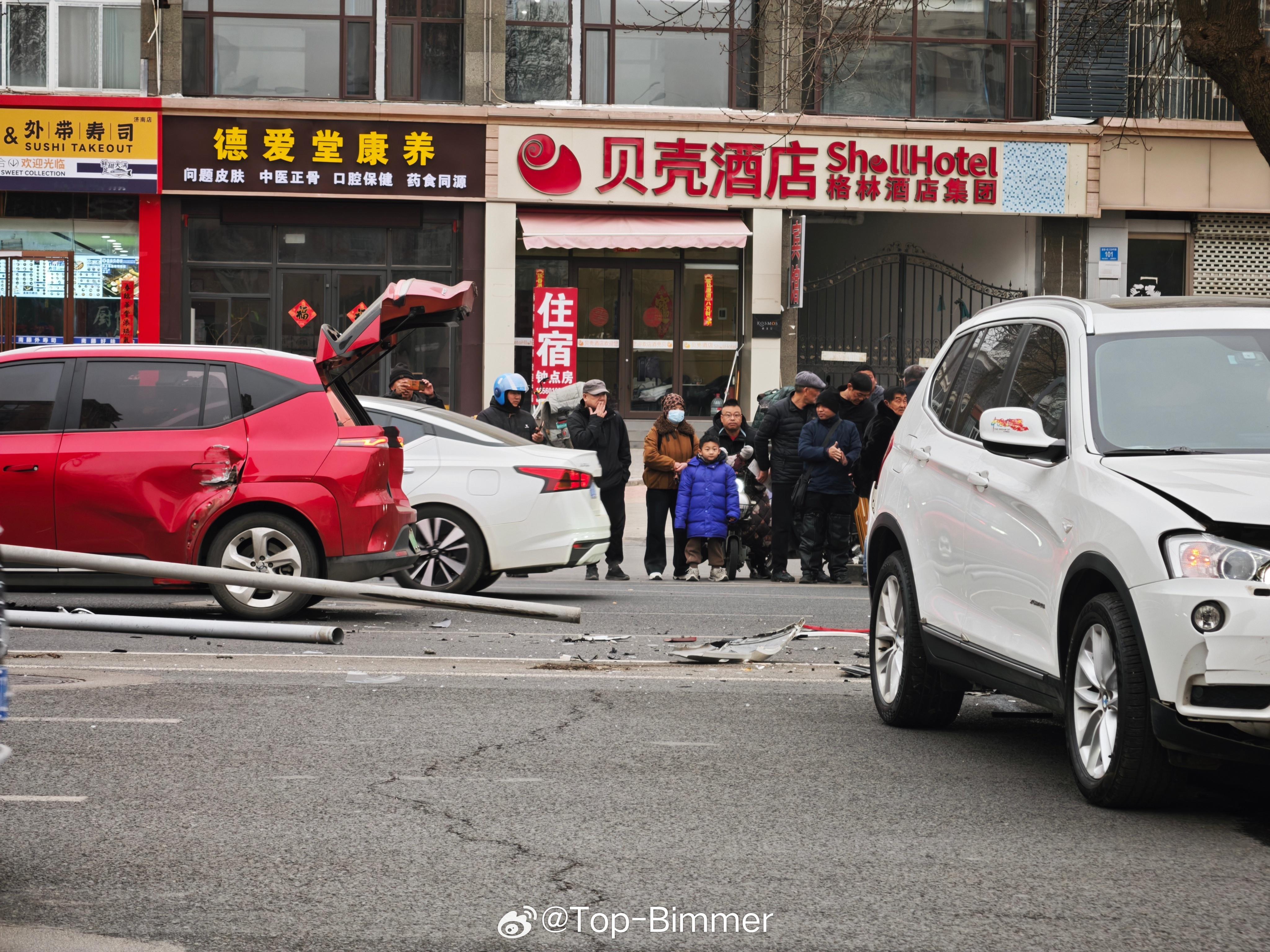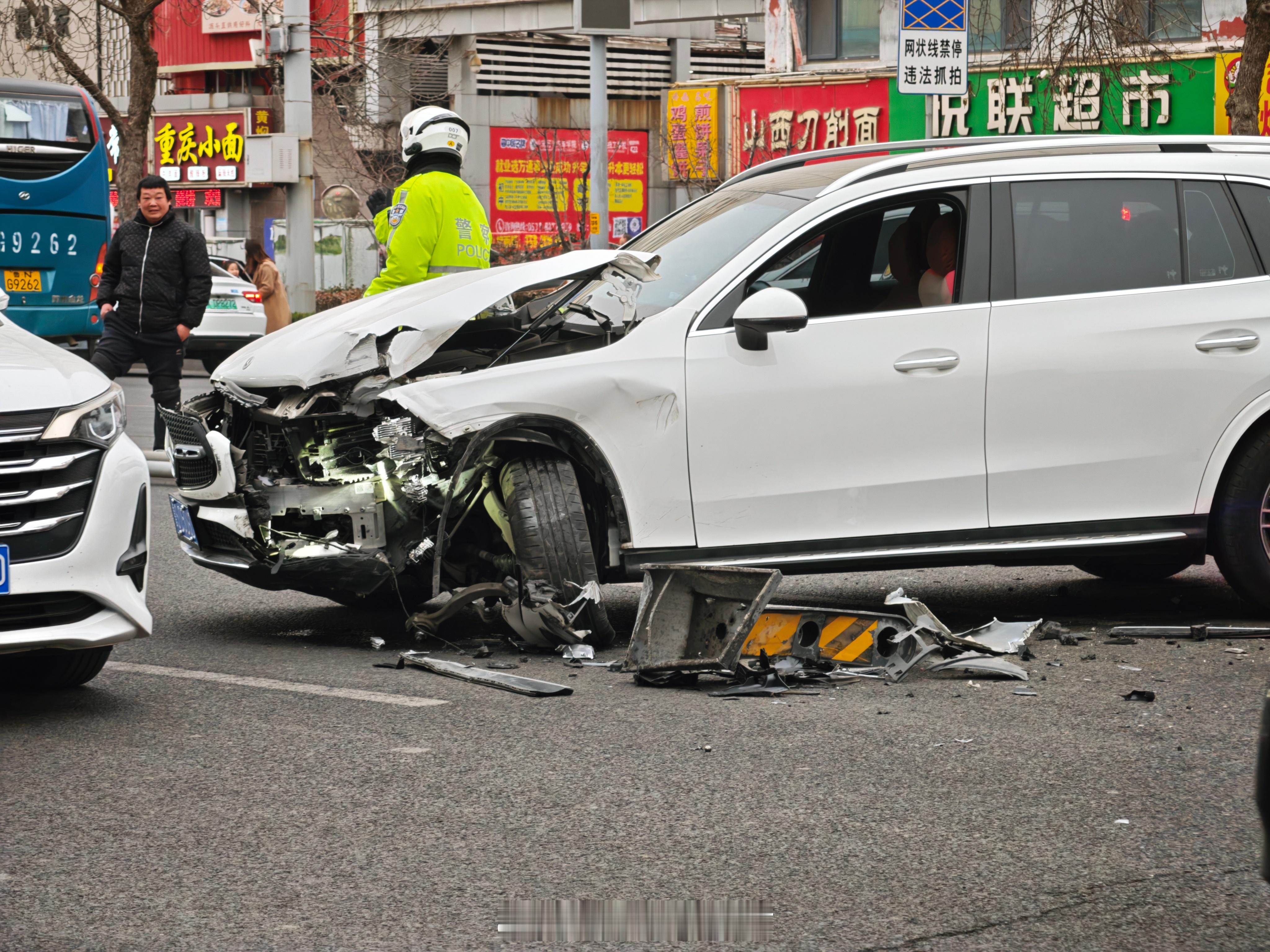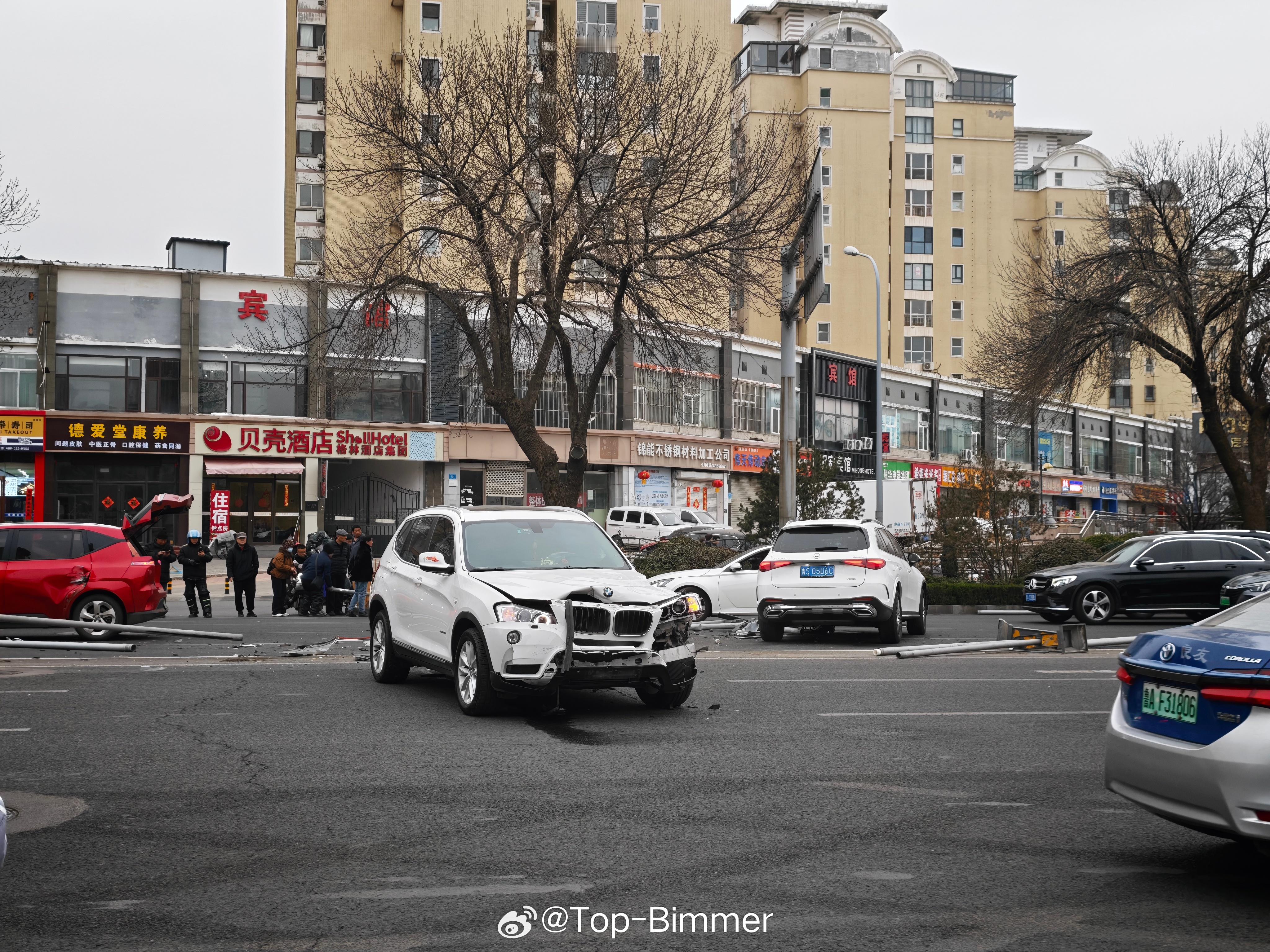 奔驰冲到了对向车道,撞了宝马,宝马连带小红车。听说是奔驰司机(图2)玩手机走神了