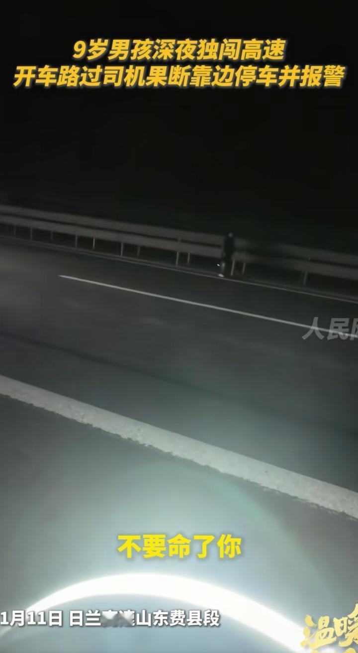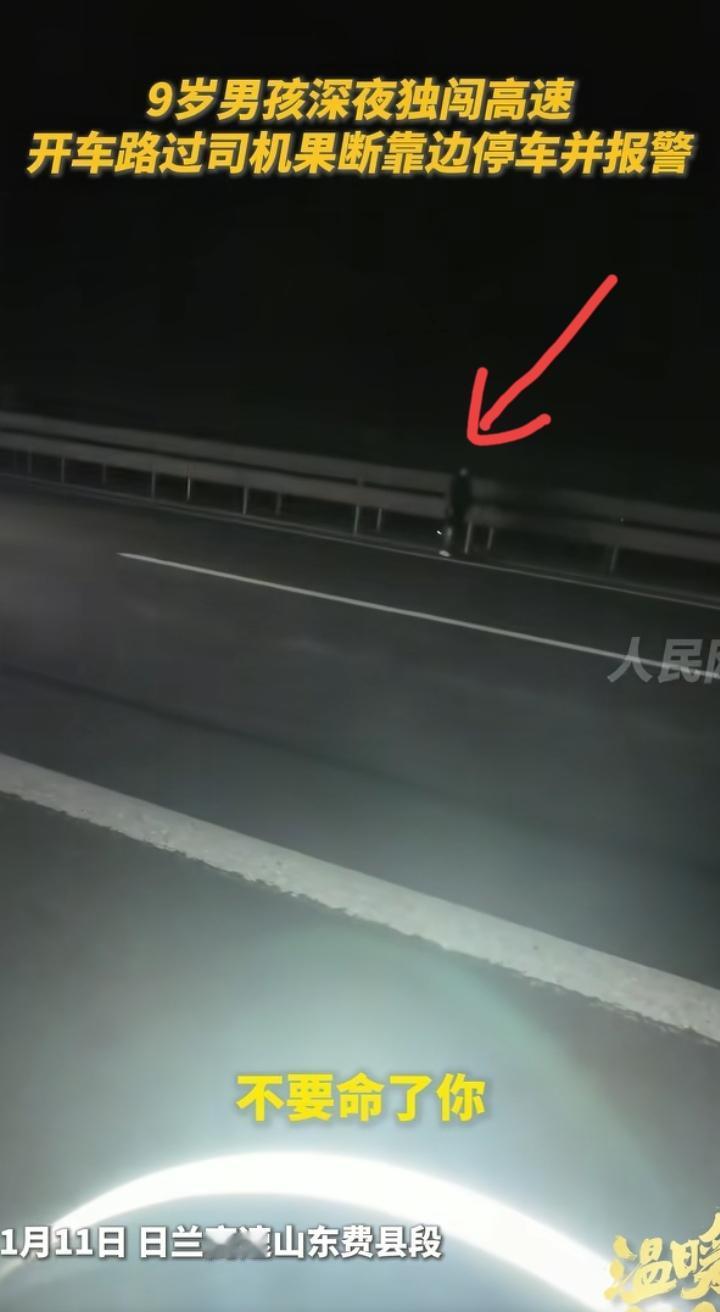 9岁的男孩子,穿着一身黑色,背着一个黑色的书包,大晚上黑灯瞎火的,一个人走在车辆疾驰的高速公路上。 幸亏遇到了送货途中的杨建文,把孩子送到服务区交给警察,现已安全回家。 那孩子小小的,在路上摔了,头上和耳后都伤着,杨建文怕他饿了,就带他去超市买零食,看他拿水杨建文就说他可以选脉动之类贵一点的饮料,孩子什么零食都没选,只要了一瓶矿泉水,就凭这一点就感觉小孩子还是很乖的。 个人觉得孩子教育,首先还是要保证安全,学习的事情可以慢慢来,不要拿别人的强项去和孩子的弱项作比较。