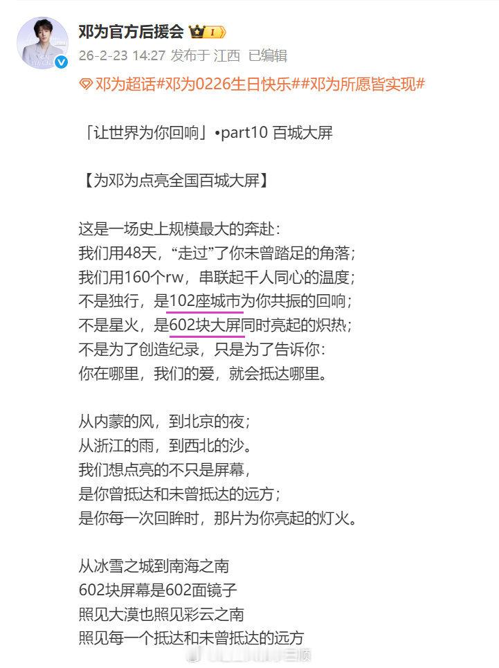 邓为生日应援,国内102城市,602大屏应援;海外也有首尔南大门,纽约时代广场等各大热门地标