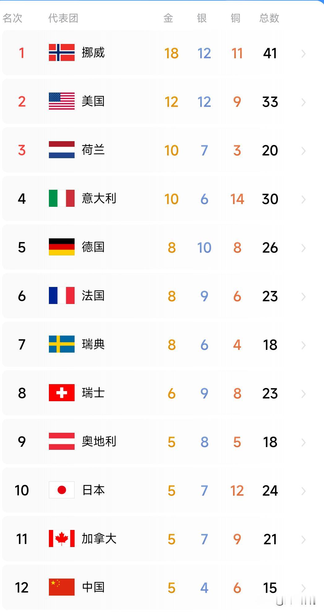 冬奥会最终奖牌榜:挪威四连冠,中国实现新突破! 2026米兰冬奥会近日落下帷幕,在最终的奖牌榜上,来自北欧的冬奥强国挪威以18金12银11铜,总计41枚奖牌的佳绩,连续四届荣登金牌榜首位,堪称当之无愧的冬奥霸主。美国和荷兰则分别位列第二、三名。 咱们中国队同样表现出色,实现了新突破!尽管上半程未能斩获金牌、排名靠后,但下半程强势逆袭,最终以5金4银6铜的成绩跃升至金牌榜第12位。苏翊鸣、徐梦桃、宁忠岩等运动员发挥出色,成功摘得金牌。 在亚洲国家中,日本排名第10。要知道,冰雪项目投入大、门槛高,发展中国家想要夺取金牌并非易事,中国健儿们的拼搏精神着实值得点赞! 米兰冬奥会奖牌 谷爱凌