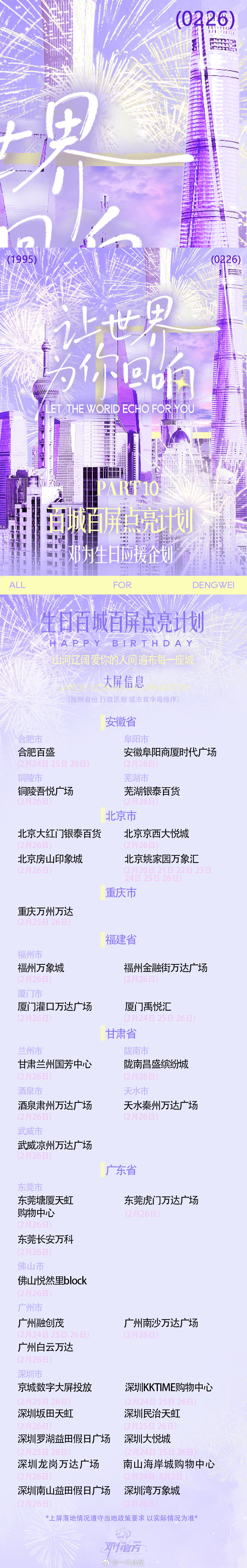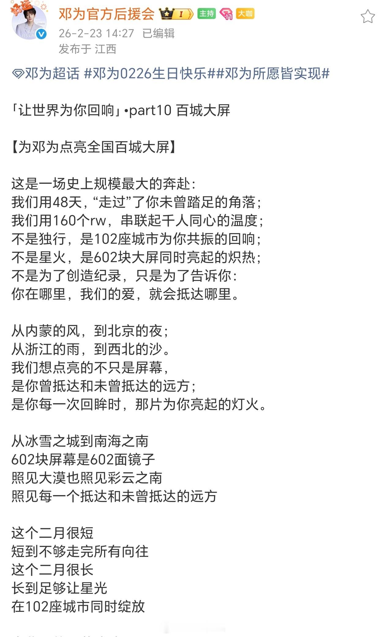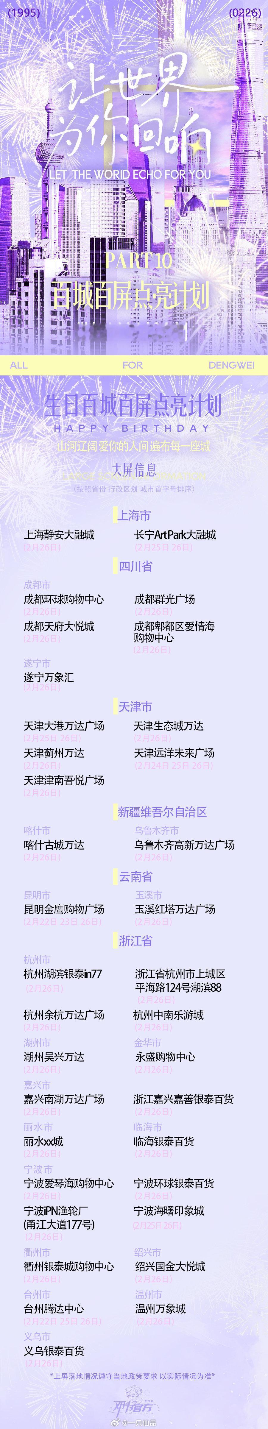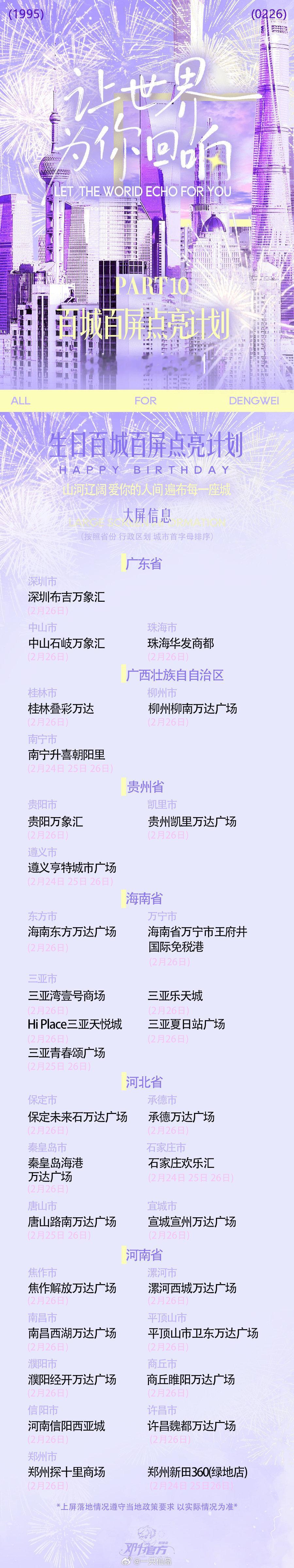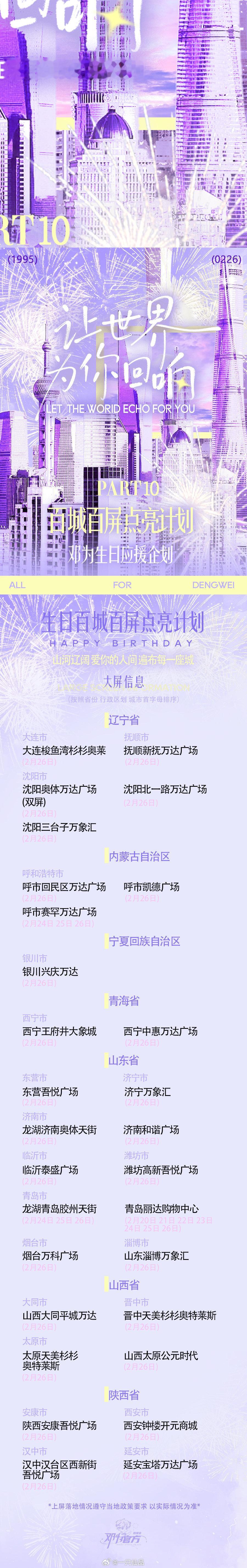 邓为生日线下百城点亮百屏应援来啦,102座城市,602块大屏。我的天啊,钻石们的爱太太太拿得出手了,真的好炽热好强烈邓为0226生日快乐,所愿皆实现邓为0226生日快乐