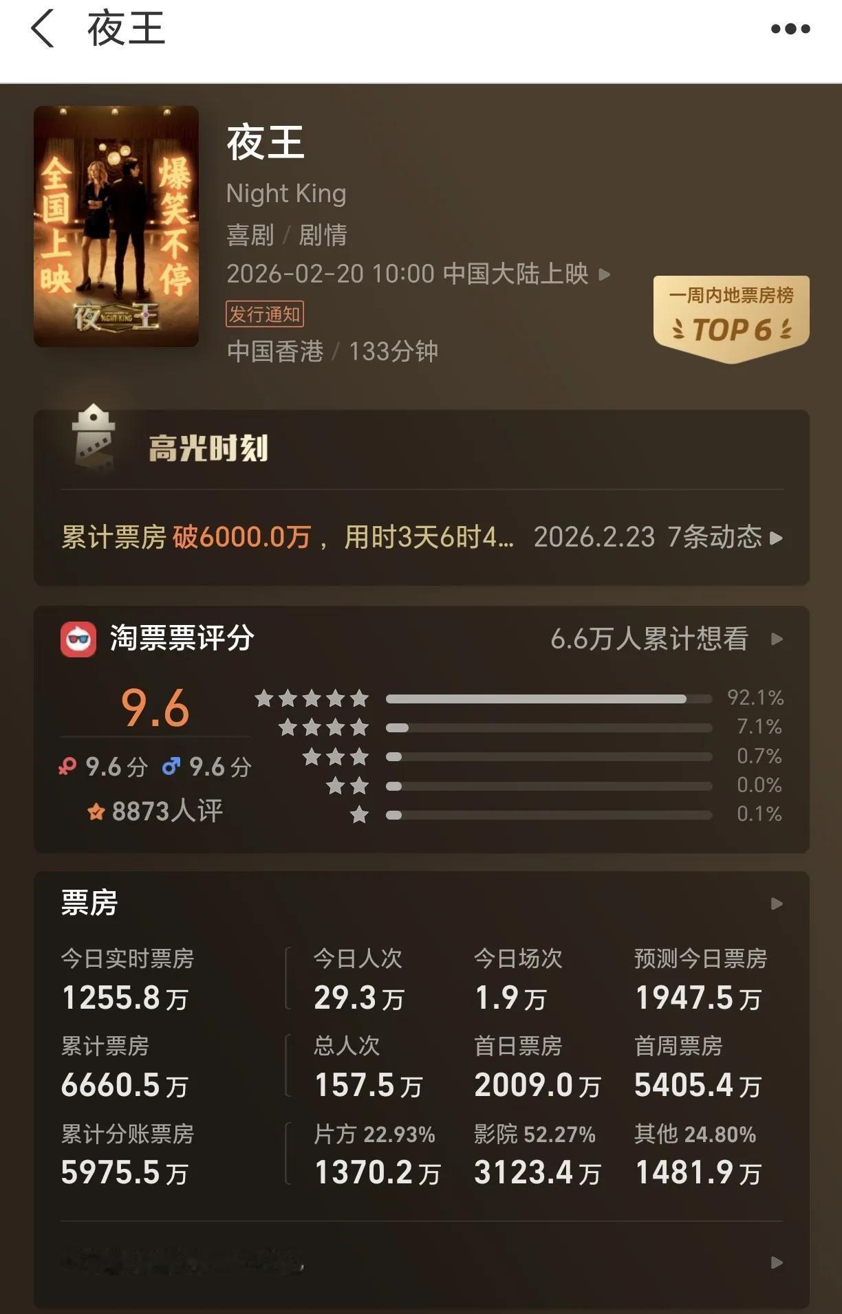 电影《夜王》给许多小成本国产电影做了个好榜样: 它的拍摄成本估计在3千万元左右,属于小成本港产粤语喜剧,没有大特效、大场面,成本主要集中在演员片酬上,取景也不多。和同档期的镖人、飞驰人生3等大制作比较,看起来毫无竞争力。 但《夜王》知道如何做好自己,没有一开始就在宣发上和其它电影硬碰硬,很明智的另辟蹊径:2月17日在香港公映后,20日才主要在两广地区限定上映,22日才在南方地区扩大上映,到了23日(今天)才全国上映。 在地方上映后,凭借电影质量获得地区观众口碑好评、自来水宣发,再逐步由点到面、逐步扩展的全国上映,电影院线排片的每一步推进都靠观众们观影后的好评支持,院校方看到观众反响也会增加排片量。 到现在,《夜王》已成了淘票票热映口碑榜第一名、评分9.6、累计票房超过6600万元,而且明显还处于上升趋势。很有可能成为又一个春节档的小成本爆款电影。 夜王电影 港片票房