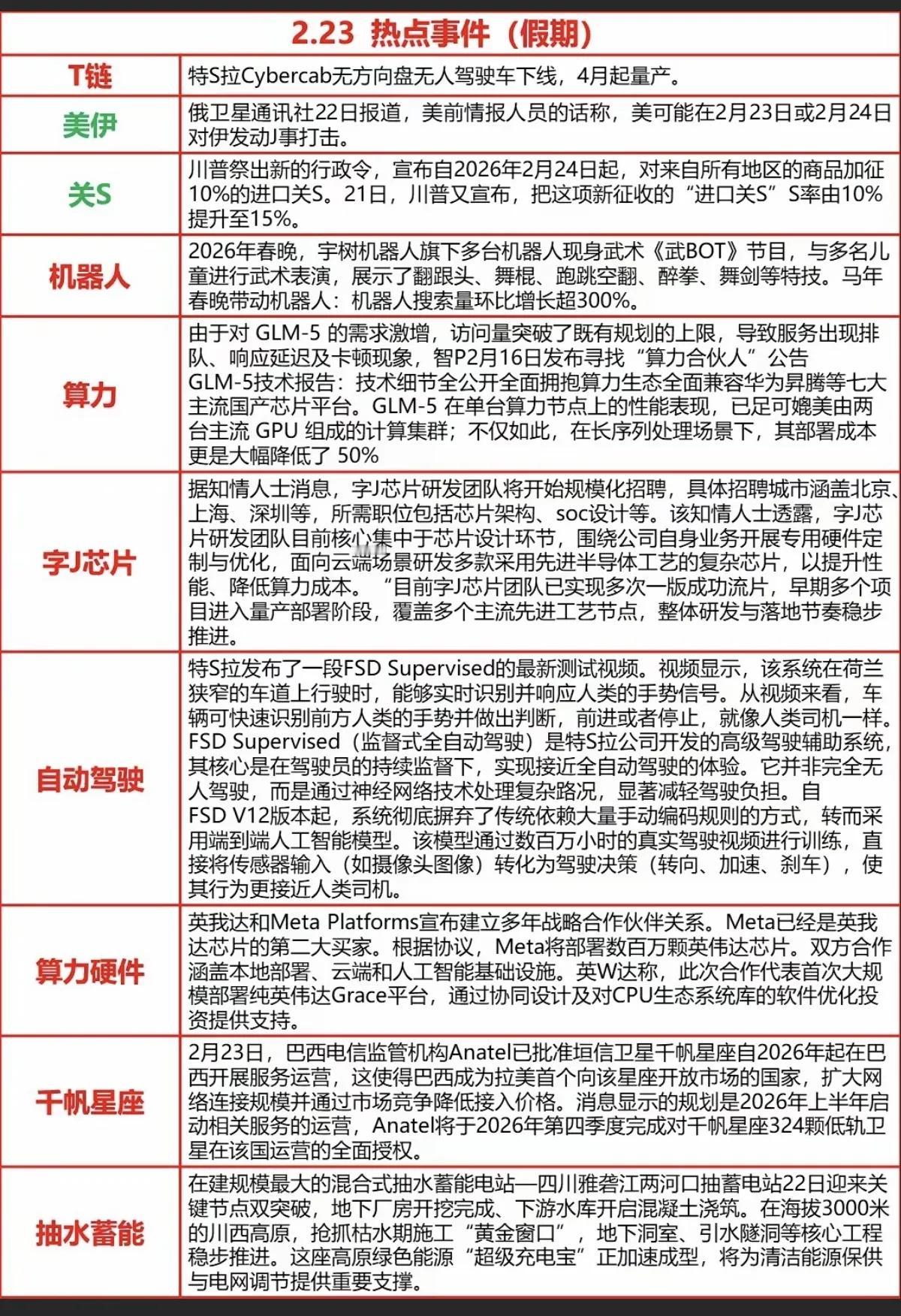 2月23日,周一A股热点事件一览表!!! 特斯拉无人驾驶车下线,计划4月份量产,相关无人驾驶概念值得重点关注;关税概念,美国计划将关税税率提升至15%,相关避险股值得重点关注;机器人概念股,春晚机器人大出风头,明日股市或有反应!!!