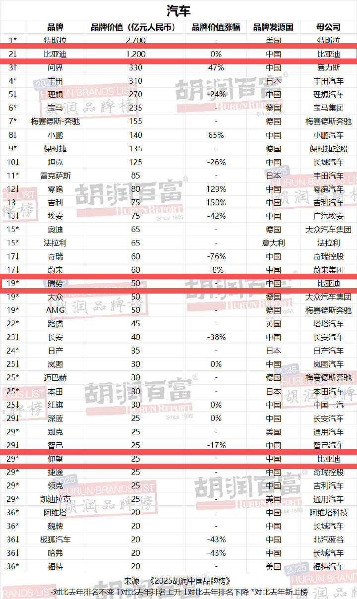 比亚迪以1200亿元品牌价值,比亚迪四年蝉联胡润汽车品牌榜,其领先地位日益巩固。