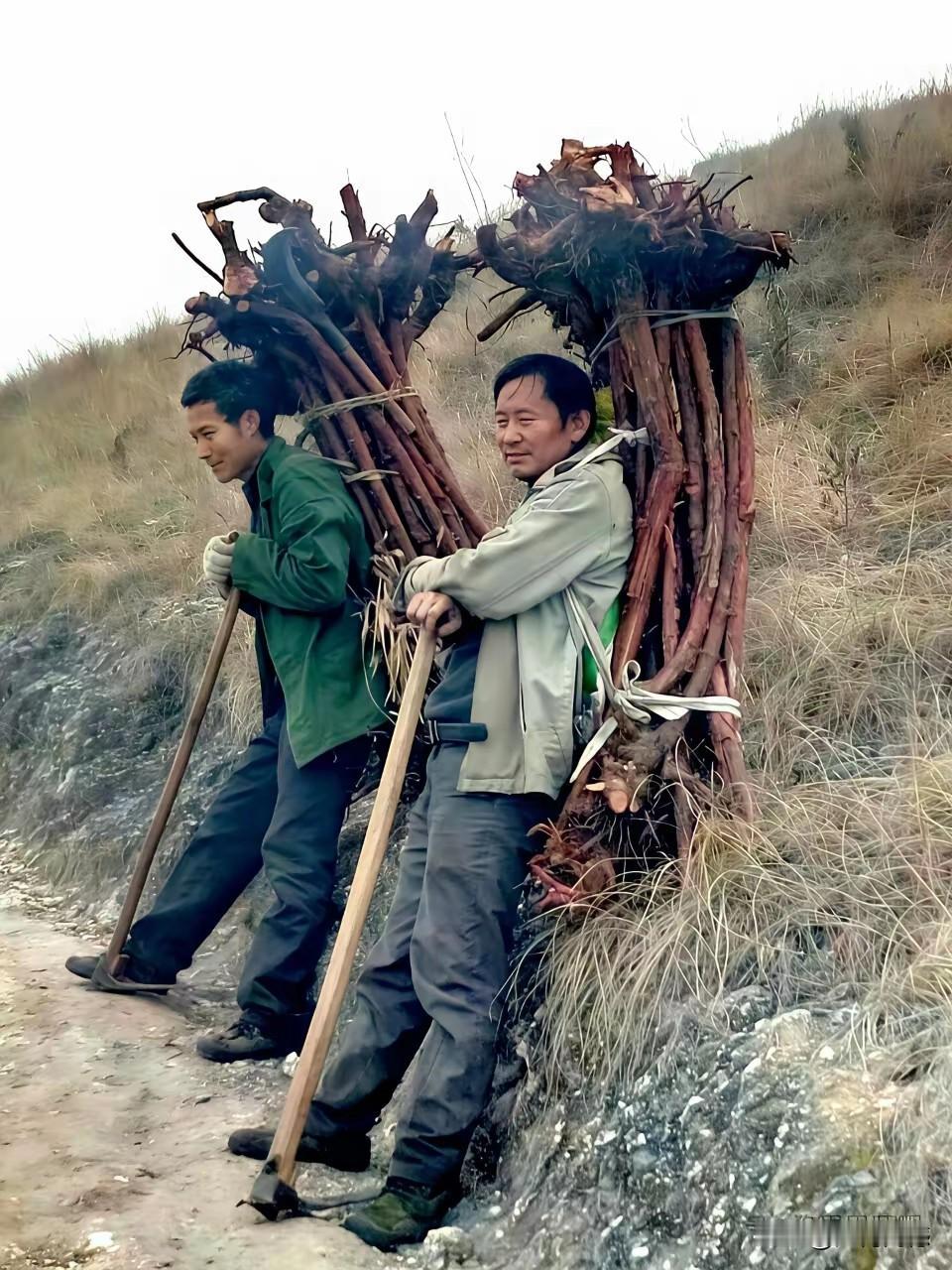 这两个人背的东西是什么?估计情况不是用来烧火的,如果仅仅是为了烧火的话,现在农村也不缺柴火,从很远的山上费力拔劲的背下来,这是非常不划算的事情,现在没人干这样的事情,感觉这种木头应该是有点说道的,没准是一些名贵的木头,用来制作一些文玩产品,也许能够赚一笔大钱呢!