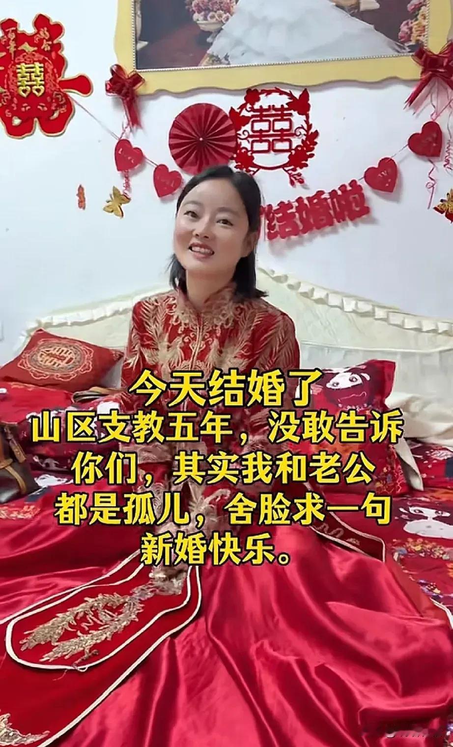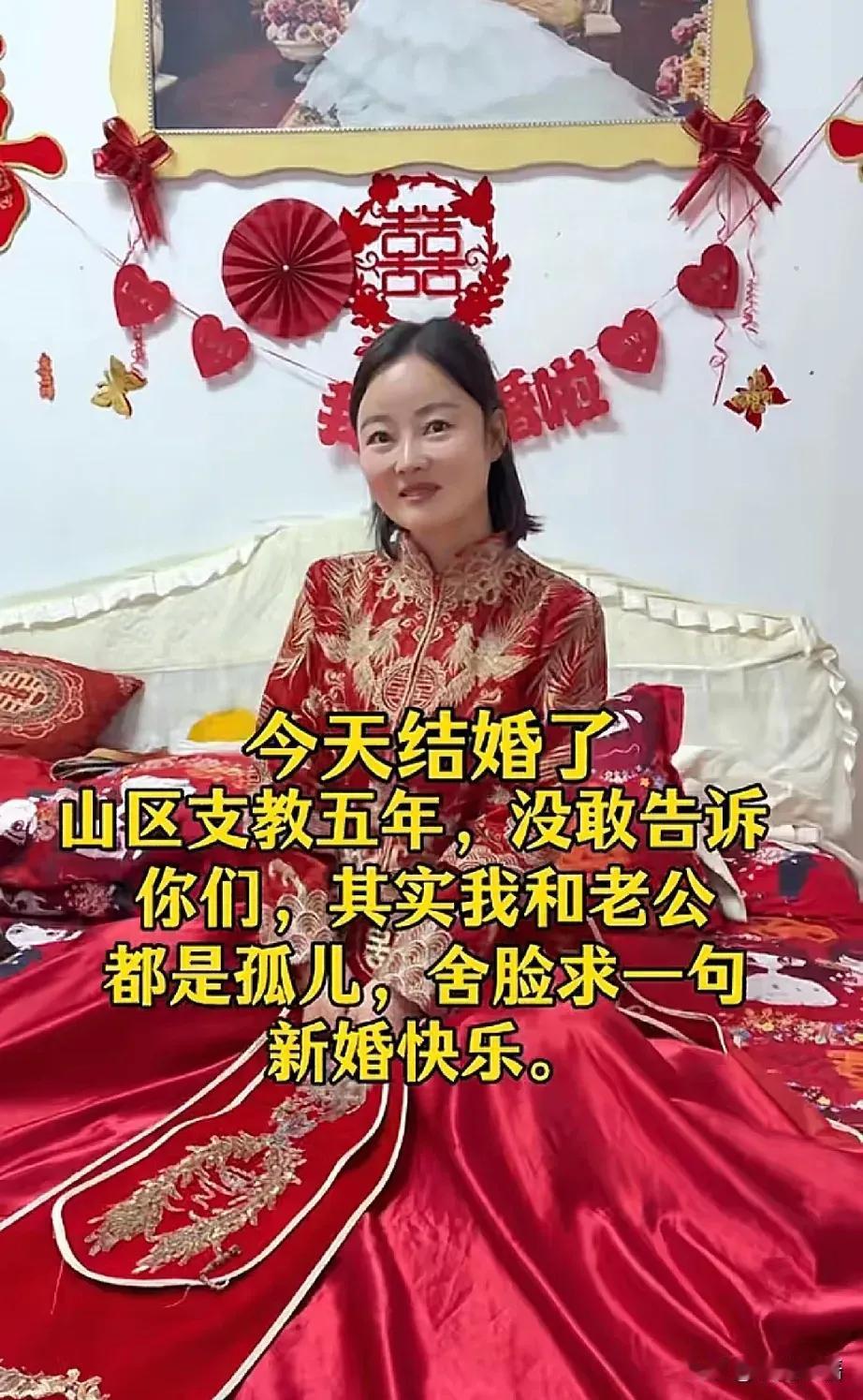 这样的一对新人结婚了。他们在山区支教五年,结婚这天才说出两人都是孤儿。没有父母亲人,没有满堂宾客,只想求得一句最诚挚的祝福。 你们是青年人的榜样。简单中充满质朴,洋溢的笑脸满满的幸福,你们缺爱却尽力给留守儿童温暖,用自己的光照亮孩子的路,给孩子们带来一缕希望的阳光,值得所有年轻人效仿。 祝你们新婚快乐,百年好合,恩爱永相随。