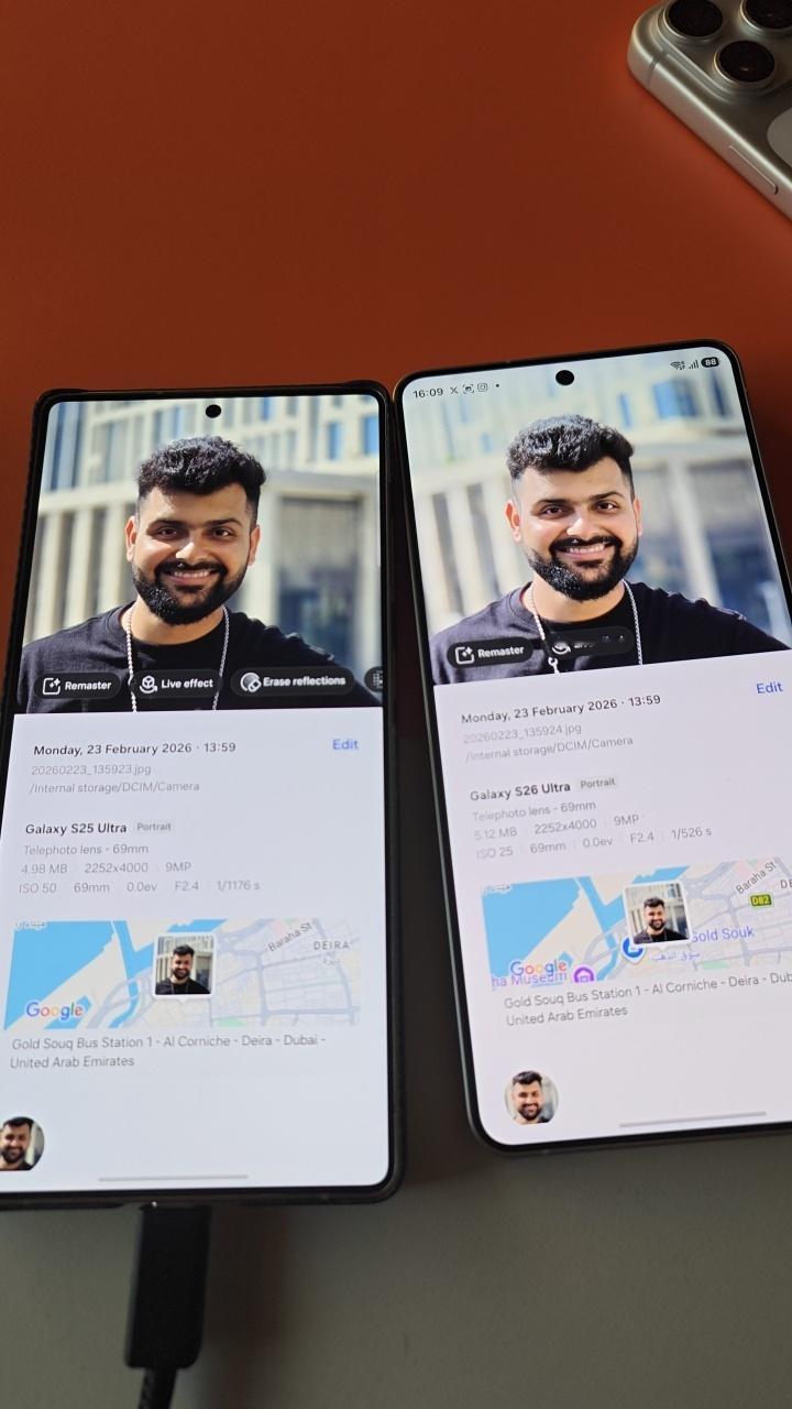 S26 Ultra和S25 Ultra 不开启防窥功能时的屏幕对比。可以隐约看到M14发光材料的一个标志,那就是S26 Ultra肉眼看上去,屏幕不会像S24 Ultra和S25 Ultra那样带着点绿色了。而是比较正的白。这是发光材料更换的一个标志,你们可以看之前过往的M14屏幕,都有这样的观感。