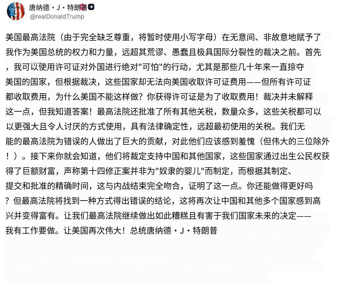 新闻快讯——特朗普抨击最高法院关税裁决,威胁将对外国采取更强硬贸易措施 美国总统唐纳德·特朗普于当地时间周一通过社交媒体发文,对美国最高法院近期的关税裁决发起猛烈抨击,称其为“荒谬、愚蠢且极具国际分裂性”,并刻意将“Supreme Court”全小写以示极度不满。 特朗普在声明中宣称,最高法院的裁决意外地赋予了他更大的权力,使他能够利用许可权限对“几十年来剥削美国”的国家采取“可怕”行动,并将已获批的关税以“更强势、更令人厌恶的方式”加以运用。他同时对裁决中禁止向外国收取许可费的条款提出质疑,认为这违背了“发放许可即收费”的普遍逻辑。 此外,特朗普还警告,若最高法院未来在宪法第十四修正案相关议题上做出不利于美国的裁决,将使中国等国家“开心获利”,并再次损害美国利益。他最后重申“让美国再次伟大”的口号,表示将继续推进其政策目标!