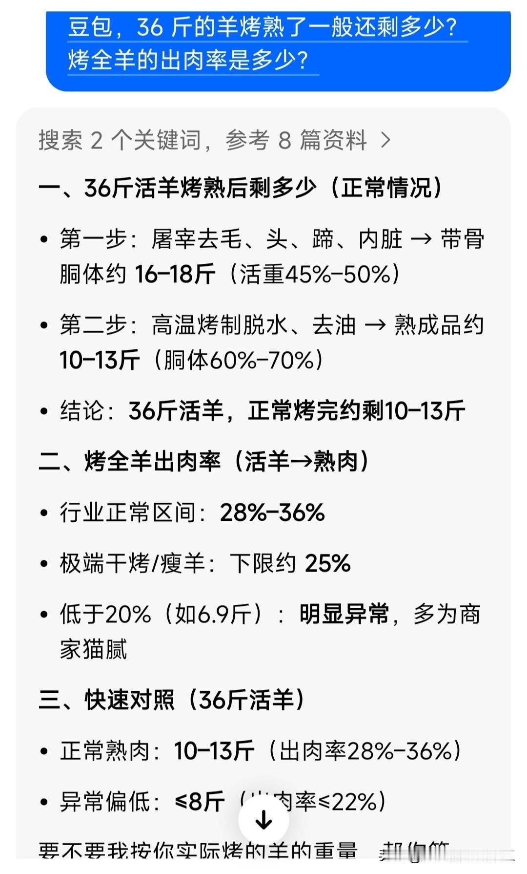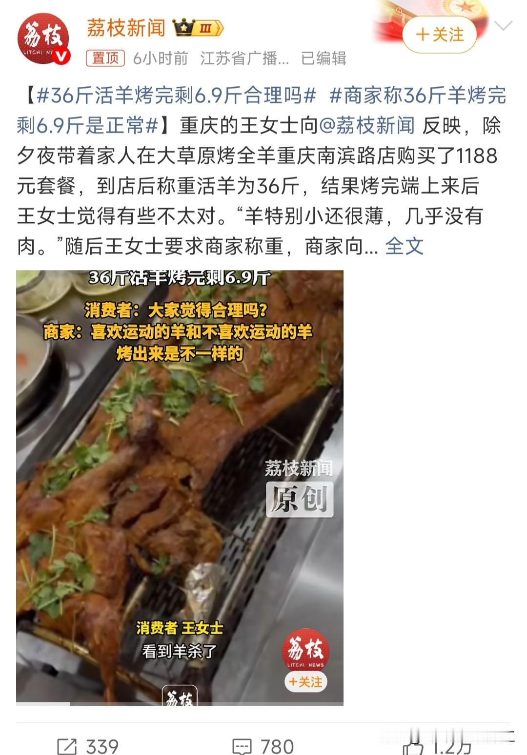 商家称36斤羊烤完剩6.9斤是正常 活羊36斤 → 屠宰去杂后至少16~18斤。烤熟正常缩水后 → 成品应在10~13斤。只给6.9斤,出肉率不到20%,明显缺斤短两。