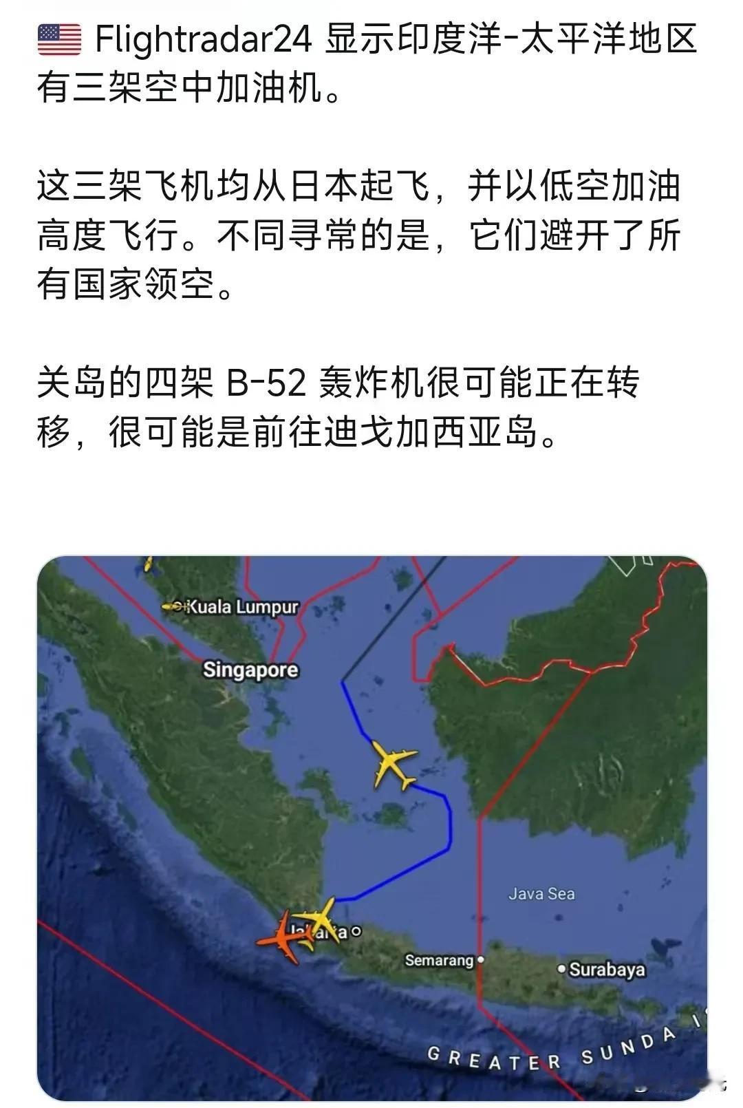 美军战机避开各国领空在秘密调遣,飞行数据网站Flightradar24 显示印度洋-太平洋地区有三架空中加油机。这三架飞机均从日本起飞,并以低空加油高度飞行。 不同寻常的是,它们避开了所有国家领空。关岛的四架 B-52 轰炸机很可能正在转移,很可能是前往迪戈加西亚岛。美国空军加油机 美国海军“杰拉尔德·R·福特”号航空母舰被发现正通过直布罗陀海峡进入地中海
