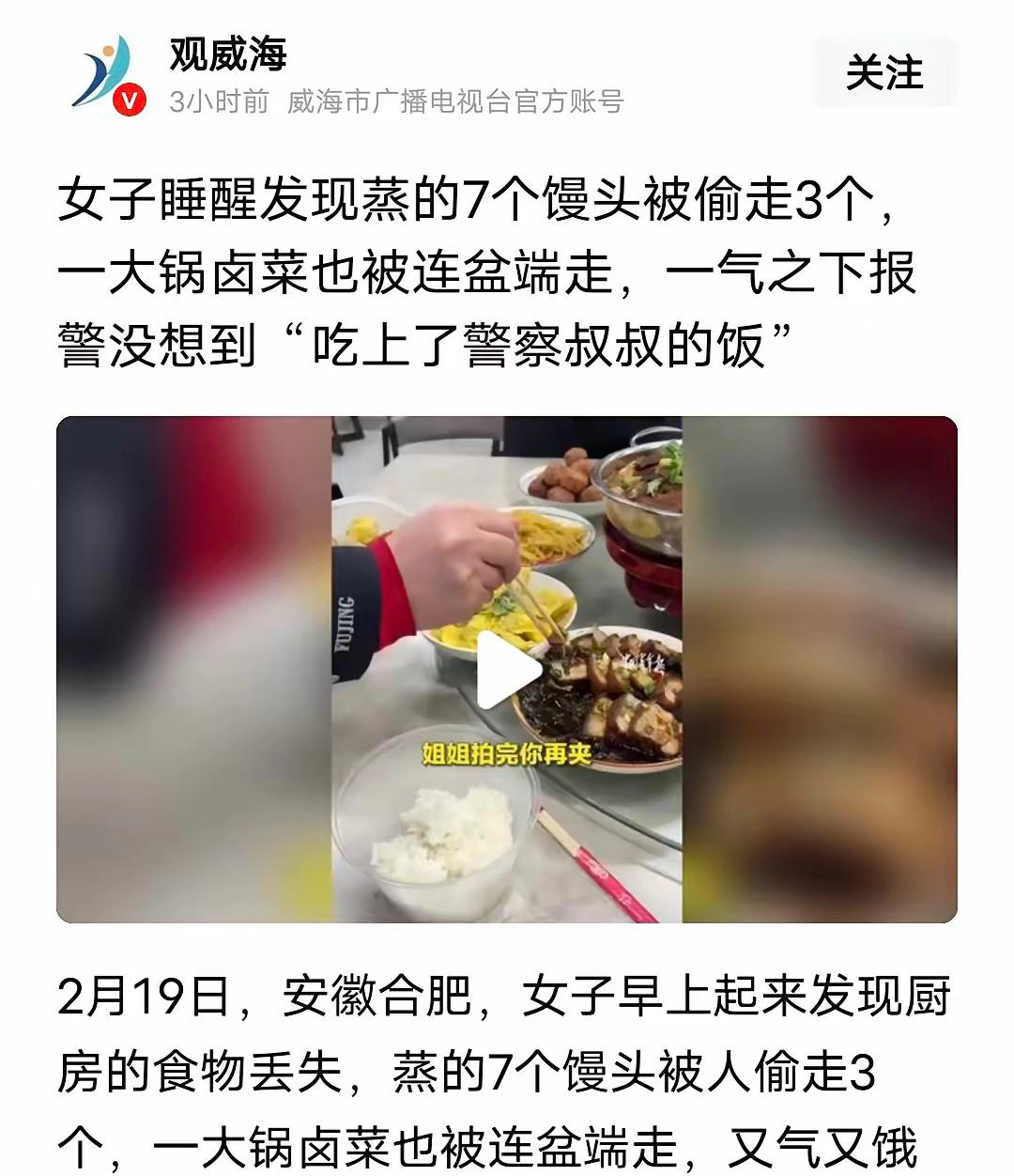 笑哭了!安徽合肥,大年初三,女子睡醒发现蒸的7个馒头,被人偷走3个,一大盆卤肉被连盆端走,女子又饿又火大,直接跑派出所报警,帽子叔叔对她说:为弥补你的损失,中午在这吃饭,还有热闹看。女子也没客气,留下了,中午吃饭时,所长开玩笑,说要给女子点两个卤菜。女子连忙说不用、不用,而接下来发生的一幕,女子消气了不说,还开心的不得了。 她前一晚特意忙活大半天,卤了猪耳朵、猪脸等满满一大盆肉,又蒸好7个暄软的白馒头,就等着大年初三睡醒吃顿热乎的解解馋。睡醒走进厨房的那一刻,她整个人都懵了,蒸笼里只剩4个馒头,那盆费了功夫的卤肉连盆带肉消失得干干净净,自己忙活半天的成果被人偷了个精光,肚子饿得咕咕叫,火气一下子就顶到了脑门。 换谁遇上这种事都没法淡定,大过年的丢吃食,既添堵又闹心,她不是心疼这点东西,是这种不告而取的行为实在让人膈应。她没多想,气冲冲地就往辖区派出所跑,进门就跟民警把事情原原本本说了一遍,脸上还挂着又饿又气的委屈。 派出所里原本还有一对在调解纠纷的夫妻,吵得脸红脖子粗,听完她的遭遇,居然瞬间停了争吵,跟着在场的民警一起笑了起来,原本紧张的氛围一下子变得轻松。接待她的民警没有丝毫不耐烦,更没觉得这是小事不值得处理,一边认真记录情况,一边笑着安抚她,还主动开口让她中午留在所里吃饭,说既能补上损失,还能等着看后续的热闹。 她当时又饿又没头绪,听到民警的贴心邀请,也没客气,索性留在派出所等待处理结果。中午食堂的热饭热菜端上桌,她刚拿起碗筷,所长就笑着走了过来,看着她还没完全消气的模样,开玩笑说要专门给她点两个卤菜,把被偷走的损失补回来。 她连忙摆手推辞,脸上的笑意藏都藏不住,心里的火气早就消了大半,自己报警已经麻烦民警了,哪好意思再让所里破费。没等她吃完这顿热乎饭,出警的民警就带着完整的调查结果回来了,偷走馒头和卤肉的人已经找到。 对方是一名流浪人员,大过年的没有落脚之处,也没有食物果腹,饿了整整一天,路过她家厨房门口看到热乎的吃食,一时糊涂才拿走,并非有意偷盗,也没有其他不良行为。对方还特意留了4个馒头,没把东西全拿走,看得出来也是心存分寸。 民警已经给流浪人员送上了食物和饮用水,还联系了相关部门为其安排临时救助,解决了过年期间的食宿问题。她听完整个经过,心里最后一点怨气彻底烟消云散,只剩下满满的心疼,当场表示不再追究对方的任何责任,说大过年的谁都不容易,一点吃食根本不算什么。 原本一桩闹心的失窃小事,在民警的暖心处理下,变成了春节里一段格外温馨的插曲。她不仅吃到了热乎的午饭,还亲眼看到民警对流浪人员的帮扶,心里的委屈全变成了感动,临走时不停向民警道谢,整个人开心得不得了。 这件事在网上传开后,无数网友被这份温暖打动。大家点赞的不只是民警的贴心与接地气,还有她的善良与包容,更佩服基层民警法理之外的人情温度。 过年的意义从不是一帆风顺没有小事,是困境中的帮扶,是陌生人之间的体谅,是警民之间最真挚的温情。一件小小的失窃案,没有争吵与计较,只有善意与温暖,这才是春节最动人的烟火气。 各位读者你们怎么看?欢迎在评论区讨论。