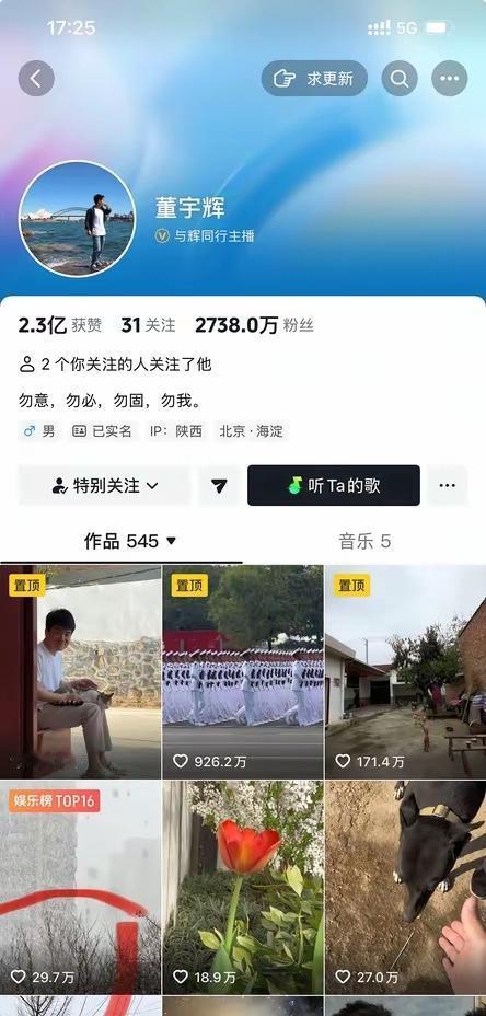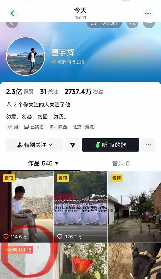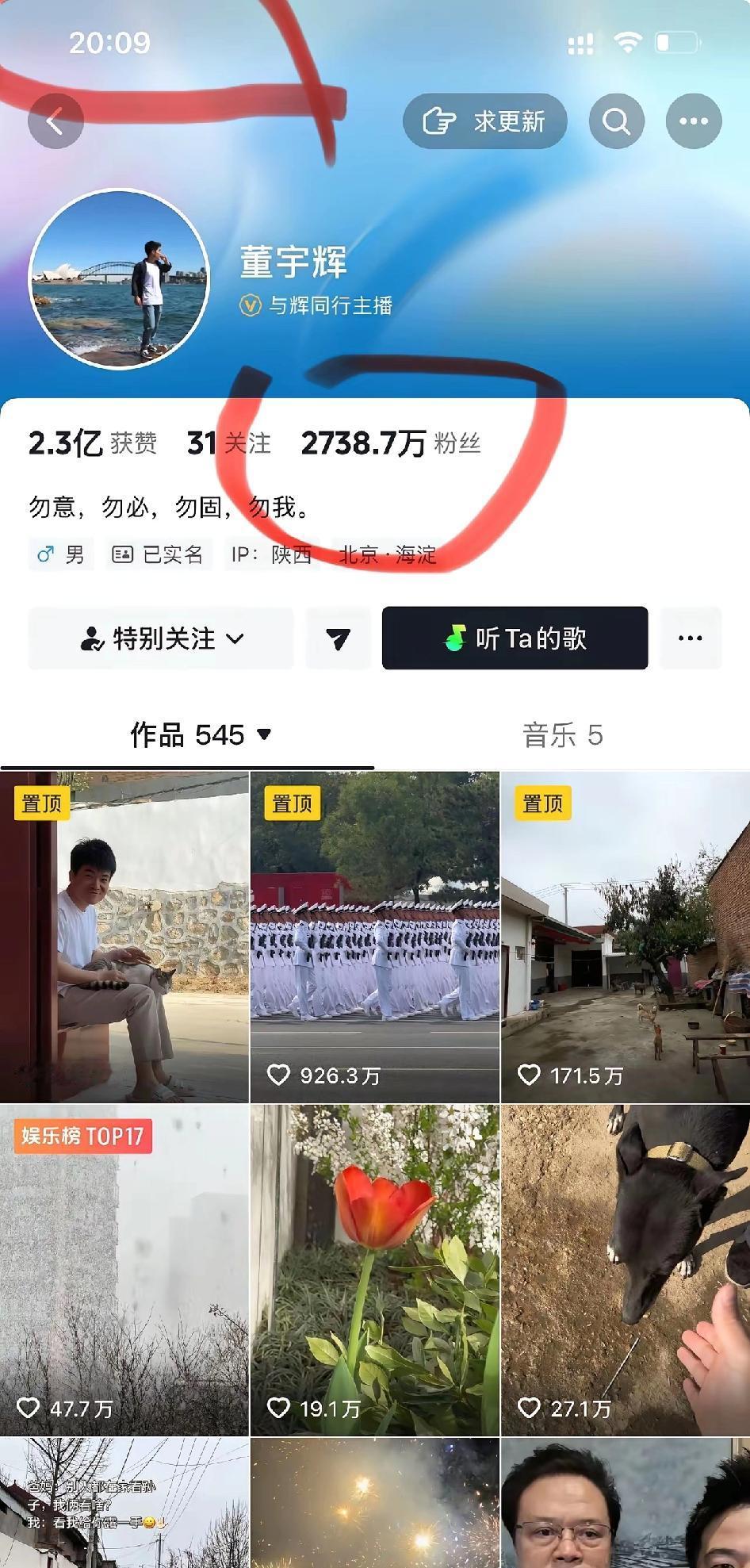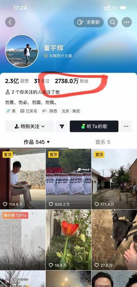 董宇辉涨粉啦!刚看还是2737万,这会儿就2738万+了,他发的西安雪景视频超火,点赞快30万。明天开播,估计还得涨,期待~