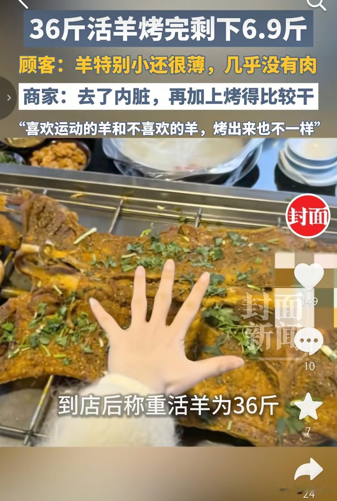 有知道原因的吗?给我分析分析,我实在想不明白,36斤的活羊怎么烤完就剩6.9斤了? 重庆的王女士最近遇到了一件离谱的事。她和朋友去吃烤全羊,商家说活羊是36斤,结果烤好端上来,看着又小又薄,几乎没什么肉,一称才6.9斤。 顾客这边肯定觉得不对劲,36斤的羊,就算去了骨头内脏,也不至于只剩这点肉吧?感觉被坑了。 商家那边的解释是,去了内脏,再加上烤得比较干,还说“喜欢运动的羊和不喜欢的羊,烤出来也不一样”。这话听着就有点扯,羊爱不爱运动,跟重量缩水能有多大关系?