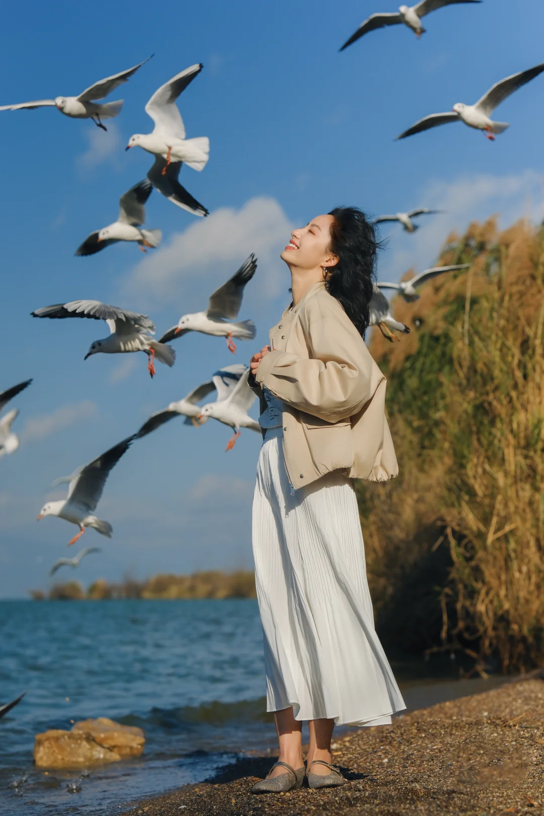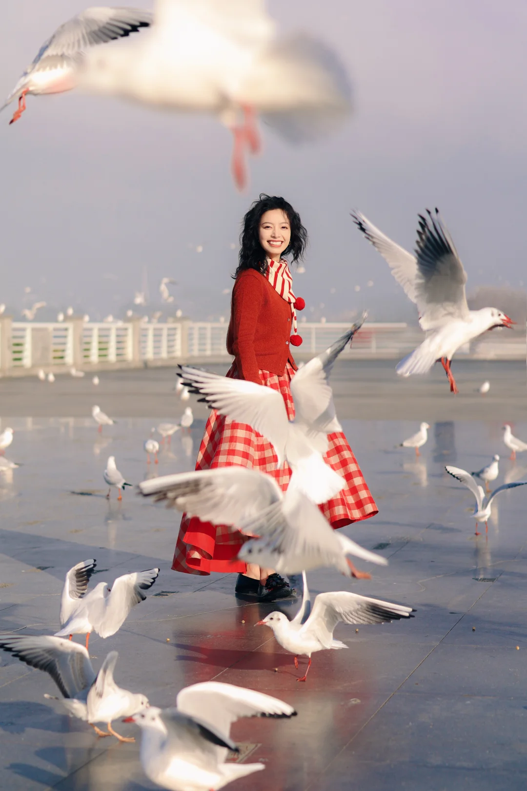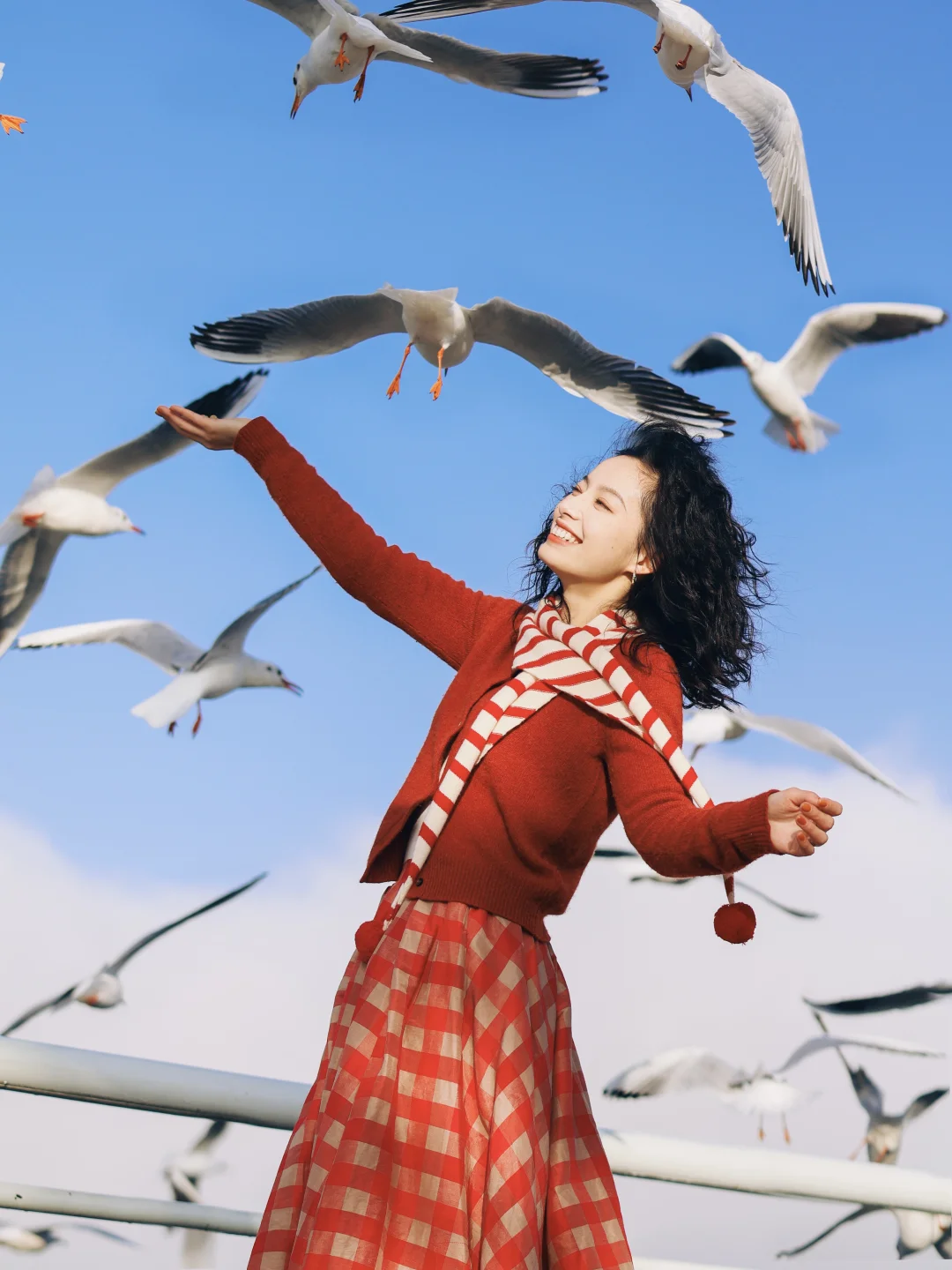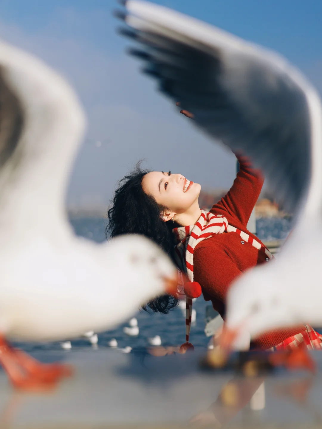 2️⃣记得穿有兜的衣服,可以把鸥粮放在兜里,往地面撒鸥粮,同时让摄影师抓拍,可以拍到被海鸥围绕的照片