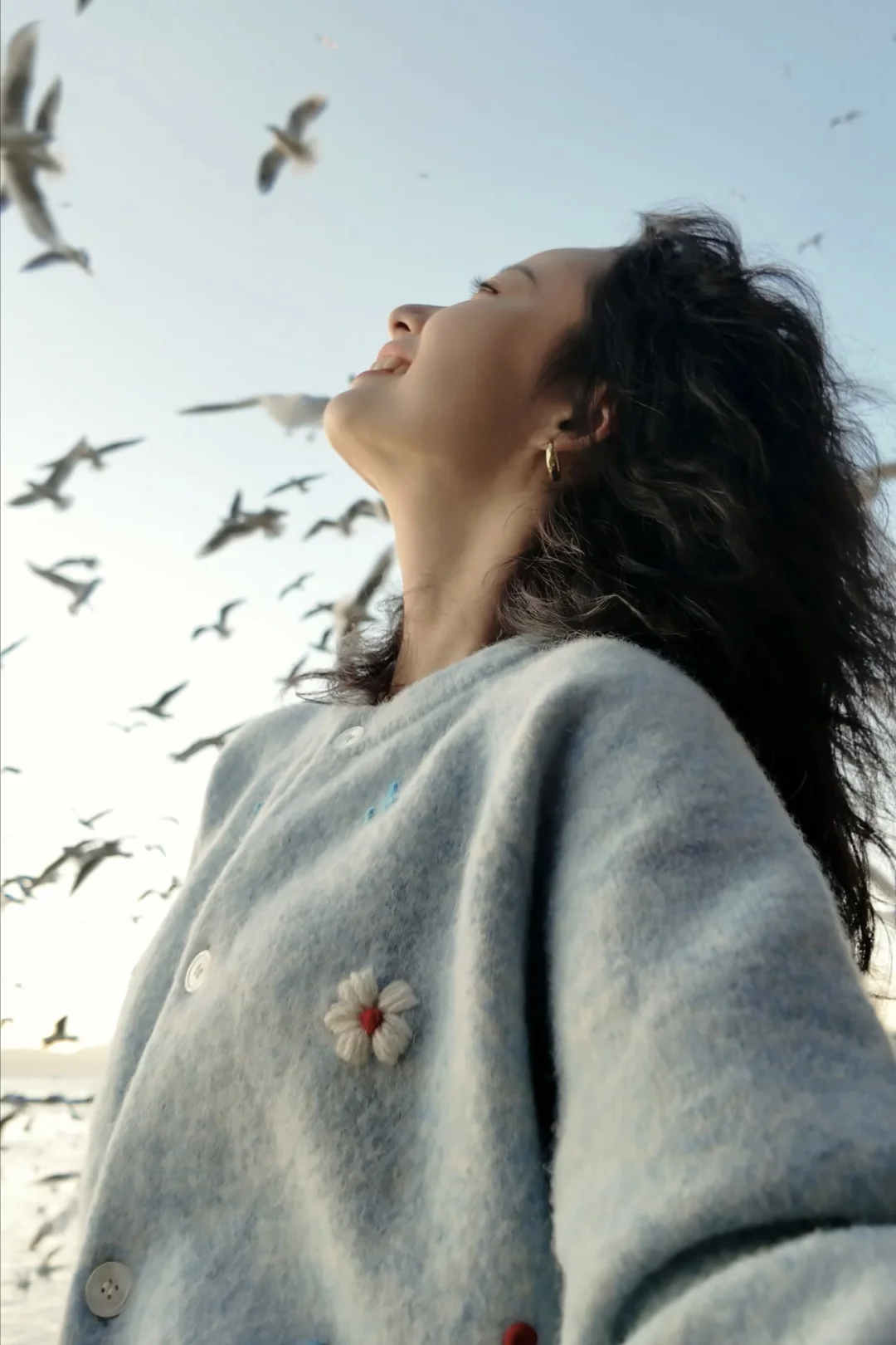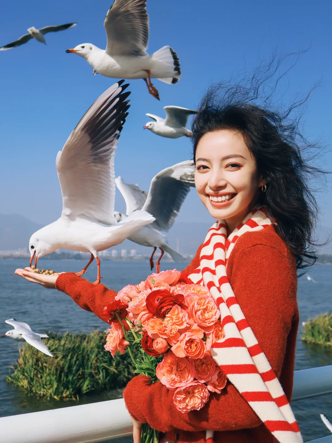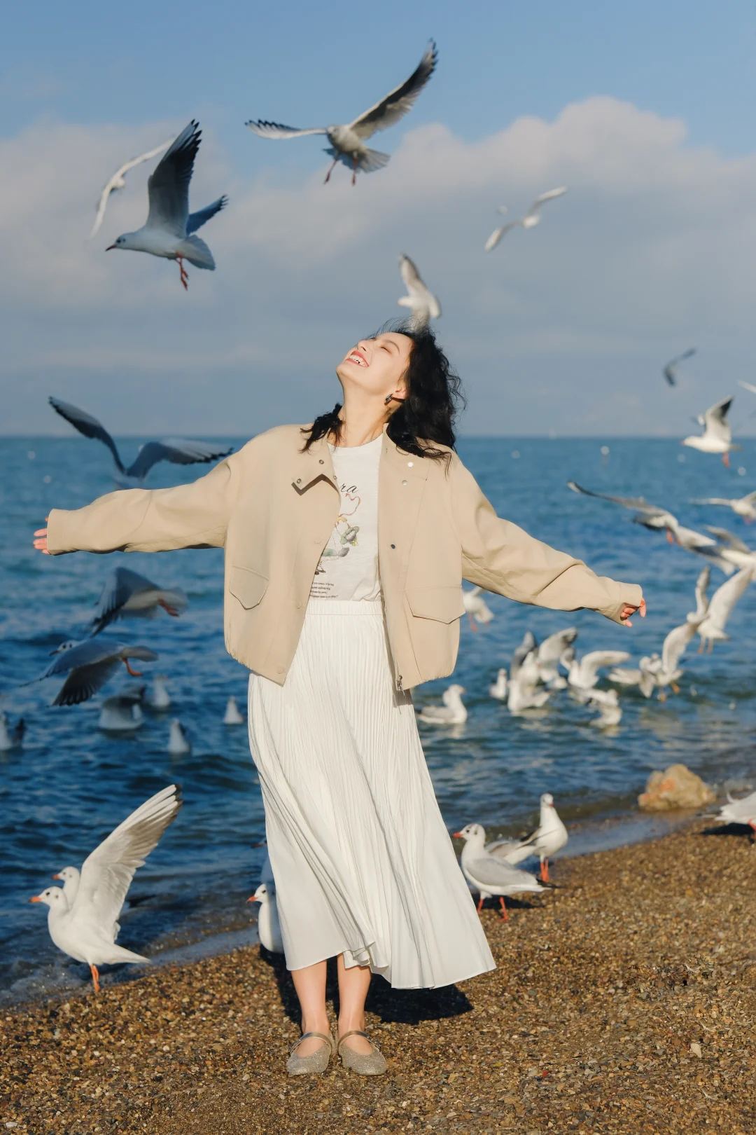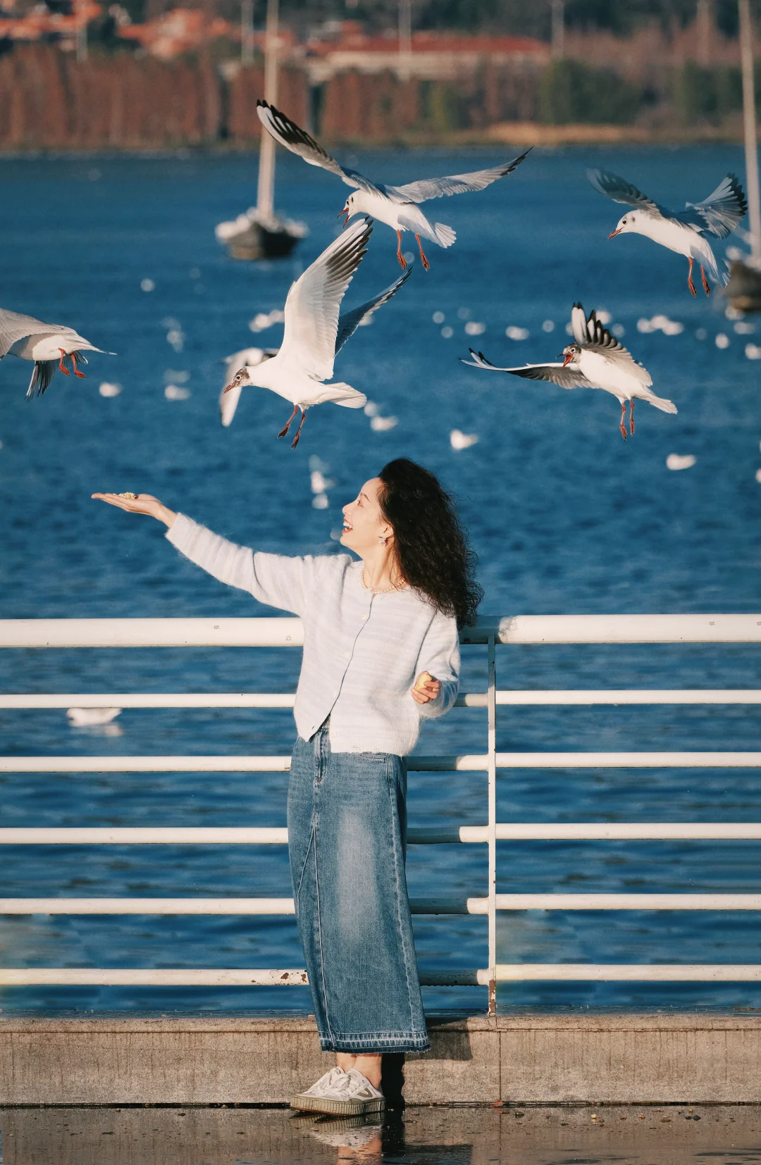 2️⃣记得穿有兜的衣服,可以把鸥粮放在兜里,往地面撒鸥粮,同时让摄影师抓拍,可以拍到被海鸥围绕的照片