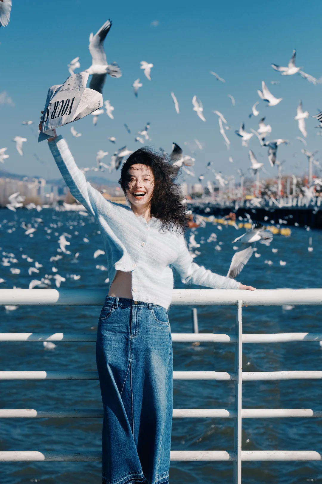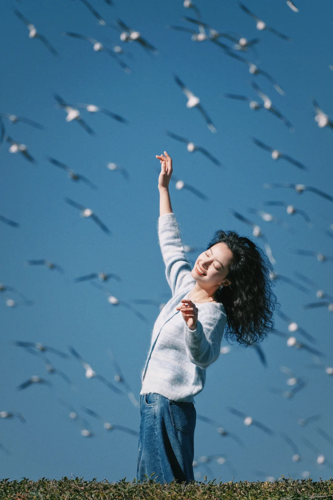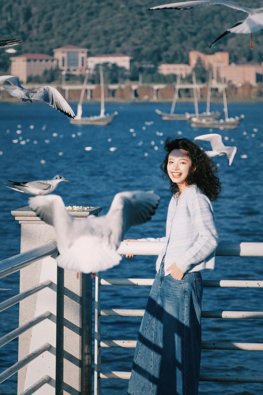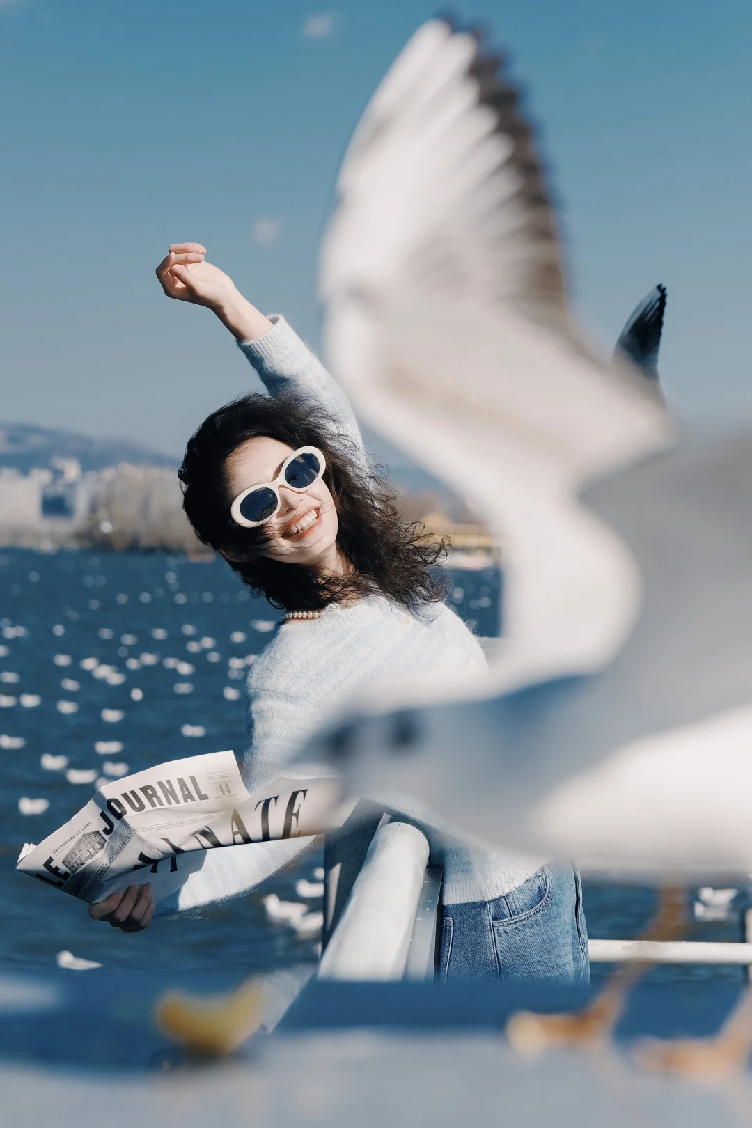 2️⃣记得穿有兜的衣服,可以把鸥粮放在兜里,往地面撒鸥粮,同时让摄影师抓拍,可以拍到被海鸥围绕的照片