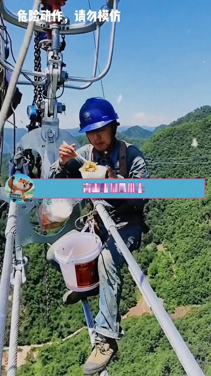 你见过在百米高空吃饭的人吗?刷到一位高空电力师傅拍下的画面,百米高空的作业线上,他一手端着碗,一手拿着筷子,脚下是广阔的田野与村庄,对我们而言是极度恐高的场景。这是他们的日常,很多人都说他们工资高,却没看到这份工作是全球死亡率最高的工种之一。 脚下是窄窄铁梁,身旁是千伏高压电,每一步都没有重来的机会,为赶进度,高空吃饭是常态,累了就靠冰冷铁架歇几分钟。到了冬天,结冰的线缆像滑溜溜的冰丝,致命的从不是高度,而是那一秒的疏忽。 如果你们刷到这些画面,千万别觉得他们是在作秀,他们是拿命在守护你回家的那盏灯,请记住这些高空上的守护者。