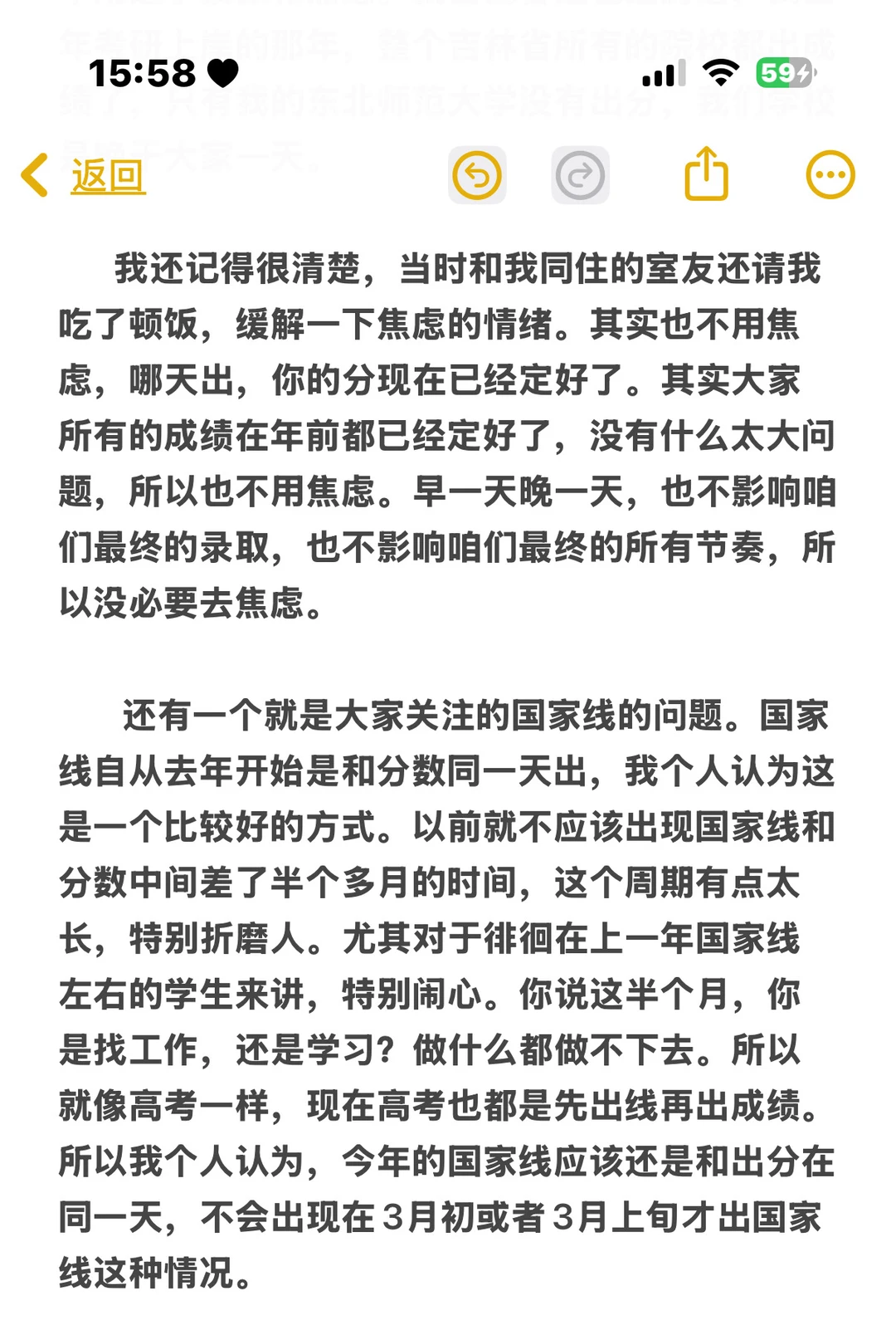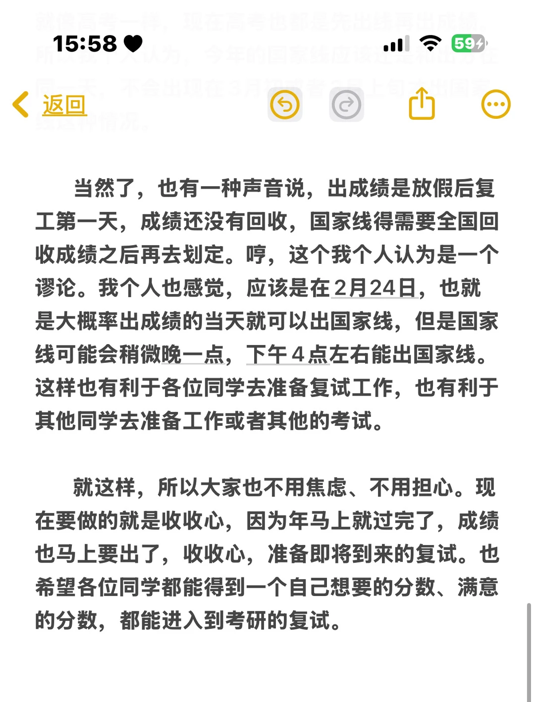 近期关于2026考研怎么样、什么时间出成绩这件事,现在闹得沸沸扬扬。年前和年后分别都有院校短暂公布了具体的出分时间,都指向了2月24日。但是这些学校都在当日修改了相关通知。当然了,今天已经2月22日了,仍然没有出查成绩的公告。但是各种迹象表明,应该是在2月24日就可以出分。因为肯定会有学校坚持不住、挺不住,每个学校就像咱们每个人一样,总会有人想抢跑,总会有人按捺不住去公布成绩,那就是相当于一石激起千层浪。所以我个人认为,应该是在2月24日可以出成绩。 但当然了,也有很多老师在疯狂拿这件事情去做文章,我个人认为没有什么太大必要。同学们也不用过于紧张和焦虑。我自己曾经也经历过,我当年考研上岸的那年,整个吉林省所有的院校都出成绩了,只有我的东北师范大学没有出分,我们学校是晚于大家一天。 我还记得很清楚,当时和我同住的室友还请我吃了顿饭,缓解一下焦虑的情绪。其实也不用焦虑,哪天出,你的分现在已经定好了。其实大家所有的成绩在年前都已经定好了,没有什么太大问题,所以也不用焦虑。早一天晚一天,也不影响咱们最终的录取,也不影响咱们最终的所有节奏,所以没必要去焦虑。 还有一个就是大家关注的国家线的问题。国家线自从去年开始是和分数同一天出,我个人认为这是一个比较好的方式。以前就不应该出现国家线和分数中间差了半个多月的时间,这个周期有点太长,特别折磨人。尤其对于徘徊在上一年国家线左右的学生来讲,特别闹心。你说这半个月,你是找工作,还是学习?做什么都做不下去。所以就像高考一样,现在高考也都是先出线再出成绩。所以我个人认为,今年的国家线应该还是和出分在同一天,不会出现在3月初或者3月上旬才出国家线这种情况。 当然了,也有一种声音说,出成绩是放假后复工第一天,成绩还没有回收,国家线得需要全国回收成绩之后再去划定。哼,这个我个人认为是一个谬论。我个人也感觉,应该是在2月24日,也就是大概率出成绩的当天就可以出国家线,但是国家线可能会稍微晚一点,下午4点左右能出国家线。这样也有利于各位同学去准备复试工作,也有利于其他同学去准备工作或者其他的考试。