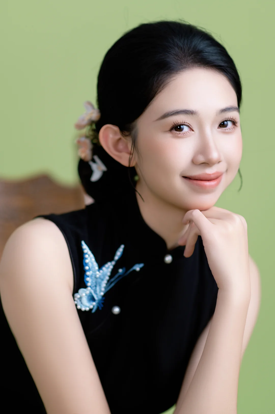 黑底蓝蝶刺绣旗袍,搭配复古盘发与珠花发饰
