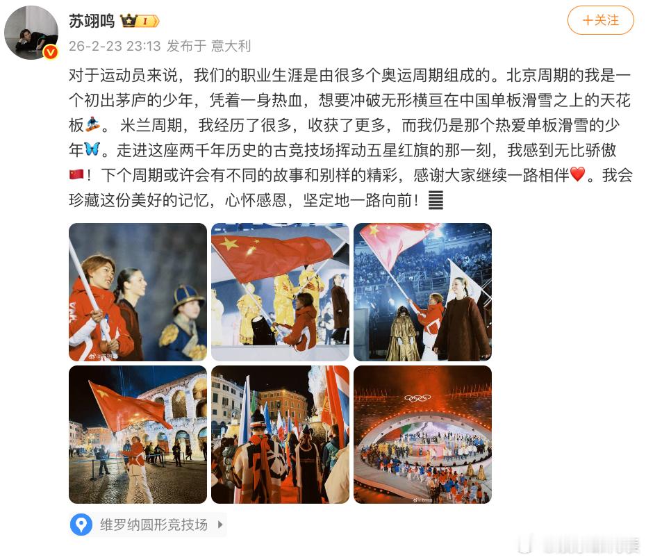 苏翊鸣发文告别米兰冬奥会:“对于运动员来说,我们的职业生涯是由很多个奥运周期组成的。北京周期的我是一个初出茅庐的少年,凭着一身热血,想要冲破无形横亘在中国单板滑雪之上的天花板🏂。 米兰周期,我经历了很多,收获了更多,而我仍是那个热爱单板滑雪的少年🦋。走进这座两千年历史的古竞技场挥动五星红旗的那一刻,我感到无比骄傲🇨🇳!下个周期或许会有不同的故事和别样的精彩,感谢大家继续一路相伴❤️。我会珍藏这份美好的记忆,心怀感恩,坚定地一路向前!🫶”