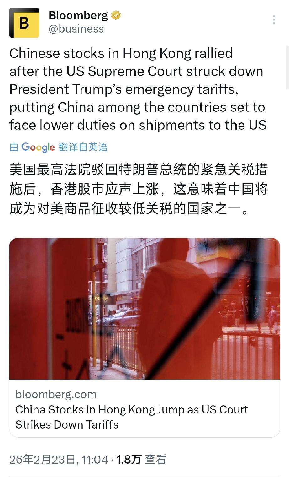 彭博社2月23日发文称,美国最高法院驳回特朗普总统的紧急关税措施后,香港股市应声上涨,这也意味着中国将成为对美商品征收较低关税的国家之一。可能很多人看到这条消息,第一反应就是外贸要回暖、股市要向好,但很少有人注意到,这场看似利好的裁决背后,藏着不少没说透的变数,甚至连特朗普本人,都没打算就此收手。先说说最直观的变化,就是香港股市的上涨,这可不是虚涨,有实打实的数据支撑。 2月23日当天,恒生指数开盘26798.97点,收盘直接涨到27081.91点,涨了2.53%,成交额也达到1729.63亿;恒生科技指数涨得更猛,涨幅高达3.34%,恒生中国企业指数也涨了2.65%。而就在几天前的2月20日,也就是最高法院刚做出裁决那天,港股还处于下跌状态,恒生指数当时跌了1.10%,恒生科技指数跌了2.91%。 一跌一涨之间,不难看出市场对关税下调的敏感,毕竟中国不少出口企业的核心市场就在美国,关税降低一分,出口成本就减少一分,企业盈利预期就好一分,反映在股市上,就是投资者的信心提振。 可能有人会问,美国最高法院为啥要驳回特朗普的紧急关税?其实核心原因很简单,就是特朗普的这项关税措施越权了。根据美国宪法,只有国会才有权力加征关税,而特朗普当时是依据《国际紧急经济权力法》,用行政令的方式推出的紧急关税,这就违反了宪法原则,最高法院最终以6:3的投票结果,裁定这项关税违法。 这也算是美式单边保护主义第一次实实在在碰了美国国内法的钉子,毕竟此前特朗普多次动用关税大棒,不管是针对中国还是其他国家,都没被自己国家的司法体系如此明确地驳回过。 但千万别以为这就结束了,特朗普的性格大家都了解,向来不会轻易认输,这场裁决反而像是给了他一个换个方式继续施压的理由。就在最高法院2月20日做出裁决的当天,他就立刻援引《1974年贸易法》第122条,宣布对全球输美商品加征10%的关税,为期150天; 更让人意外的是,仅仅过了一天,2月21日,他又在自己的社交平台上发文,把这项全球关税的税率从10%提高到了15%,还吐槽最高法院的裁决是“荒谬、措辞拙劣且极端反美”。 这种一天之内两次调整关税的操作,不仅让其他国家无所适从,就连美国自己的贸易部门都懵了,不知道该按哪个标准执行,更别提那些依赖进出口的美国企业了。 更麻烦的是,关税政策的反复无常,还留下了一大堆“糊涂账”。根据统计,此前依据特朗普那项违法关税,美国已经累计征收了超过1750亿美元的税款,现在这项关税被裁定违法,那些已经缴纳了高额关税的企业,自然要求退款,截至2月21日,已经有包括美国大型零售商开市客在内的数百家企业提起诉讼,要求退还额外支付的关税。 但问题是,最高法院的裁决并没有明确要求退还这些税款,退款的程序还要交由下级法院处理,这就导致退款前景充满不确定性,特朗普自己也承认,这场关于关税退款的官司,可能要打五年。 与此同时,中国的出口企业也在抓紧这难得的窗口期,积极抢占市场。毕竟谁也不知道150天之后,特朗普的全球关税政策会发生什么变化,也不知道他会不会再找出其他理由,针对中国商品推出新的限制措施。 从目前的情况来看,不少企业已经接到了美国客户的补单,有的客户甚至着急地要求企业在一个月内完成生产、发货,就是为了赶在关税政策再次变动之前,锁定成本、抢占库存。 就像一些主营家居、轻工产品的企业,之前因为关税过高,很多美国客户暂停了订单,现在关税下调,这些客户纷纷重启订单,甚至追加订货量,不少企业的生产线已经开始满负荷运转。 市场的积极信号确实值得关注,外贸和资本市场同步回暖,不仅体现了市场对理性贸易的期待,也说明互利共赢才是国际贸易的主流趋势。毕竟不管是中国企业还是美国企业,都不想被反复无常的关税政策裹挟,都希望有一个稳定的贸易环境,实现双赢。 但我们也要清醒地看到,这种回暖背后的不确定性依然很大,特朗普的15%全球关税已经开始酝酿,美国贸易代表也已经表态,正在寻找“重建”惩罚性对等关税的方法,甚至还在强调美国与欧盟、英国、日本等盟友的贸易协议依然有效,言外之意,后续可能会联合盟友,继续在贸易上做文章。 港股的上涨是实实在在的,企业的机遇也是实实在在的,但潜藏的风险同样不容忽视。中国企业凭借自身的韧性,抓住当下的窗口期提升出口、稳定发展,这是应对不确定性最好的方式。 但谁也无法预料,下一次关税政策的变动会在什么时候到来,特朗普还会拿出哪些新的手段维持贸易限制。那么问题来了,你觉得这场关税风波后续还会有哪些变数?中国企业该如何更好地抓住窗口期,应对可能到来的风险?欢迎在评论区说说你的看法。