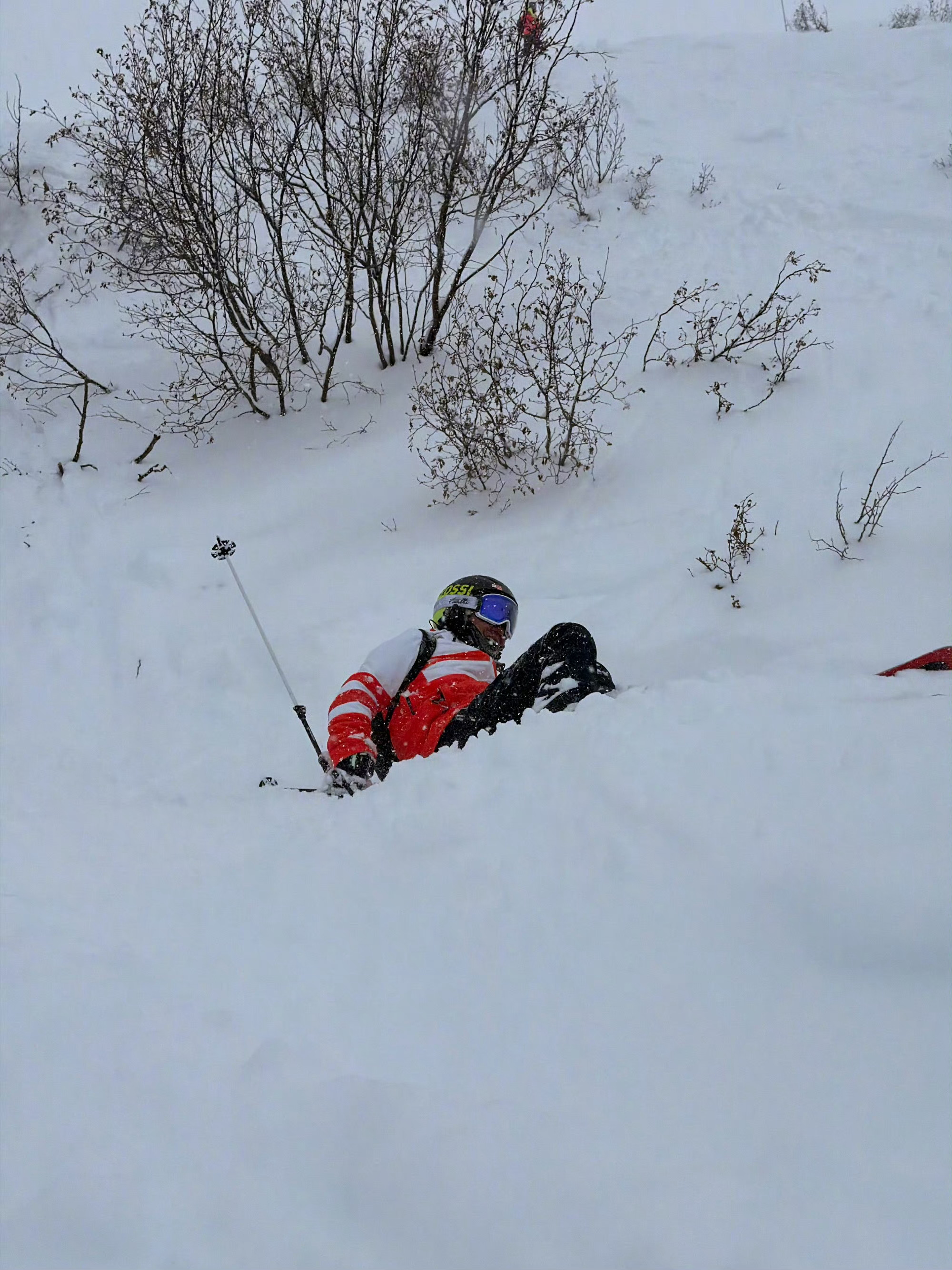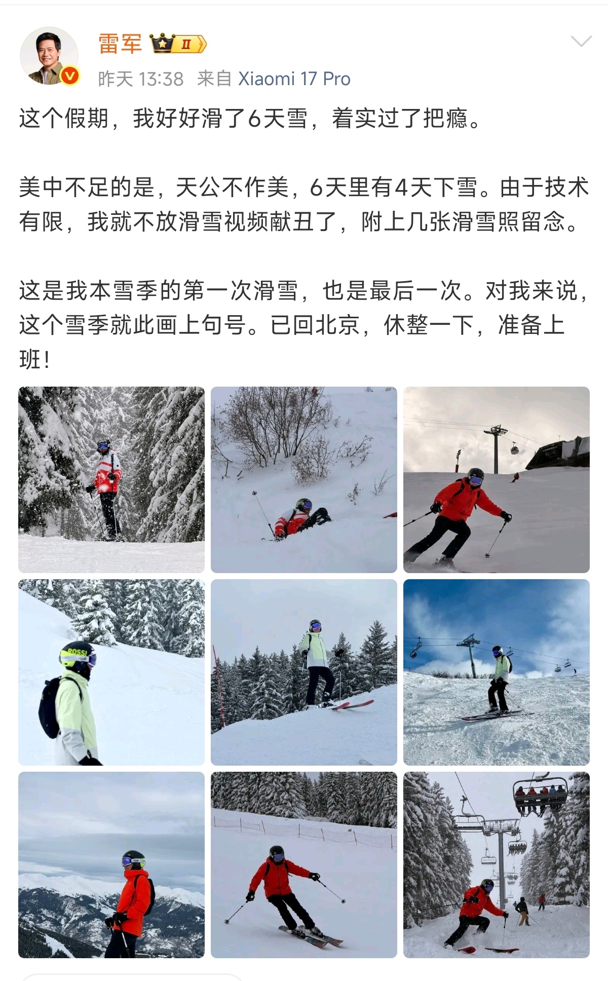 雷军滑雪照片,有一张拍的是摔倒的姿势,