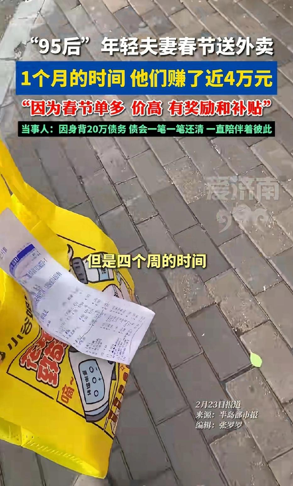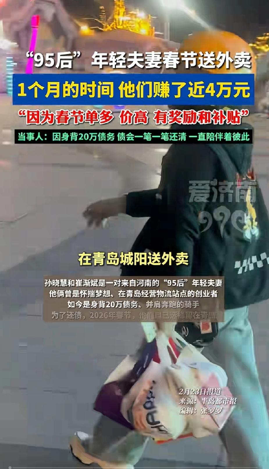 近日山东青岛,一对95后夫妻过年期间没有回家,选择留下来送外卖,一个月时间赚了了4万元,他们说出了自己的经历! 由于过年期间,好多骑手回老家过年了,导致订单运力不足,价格补贴更高,还有活动那些,所以赚的钱比较多,夫妻两人春节这一个月的时间,赚了近4万元钱,对于这个收入还是比较满意的!至于为什么会选择留下来送外卖,而不回家过年呢?原来是他们身背20多万的债务,想趁着过年这段时间,多赚点钱,好早点还完这些负债!