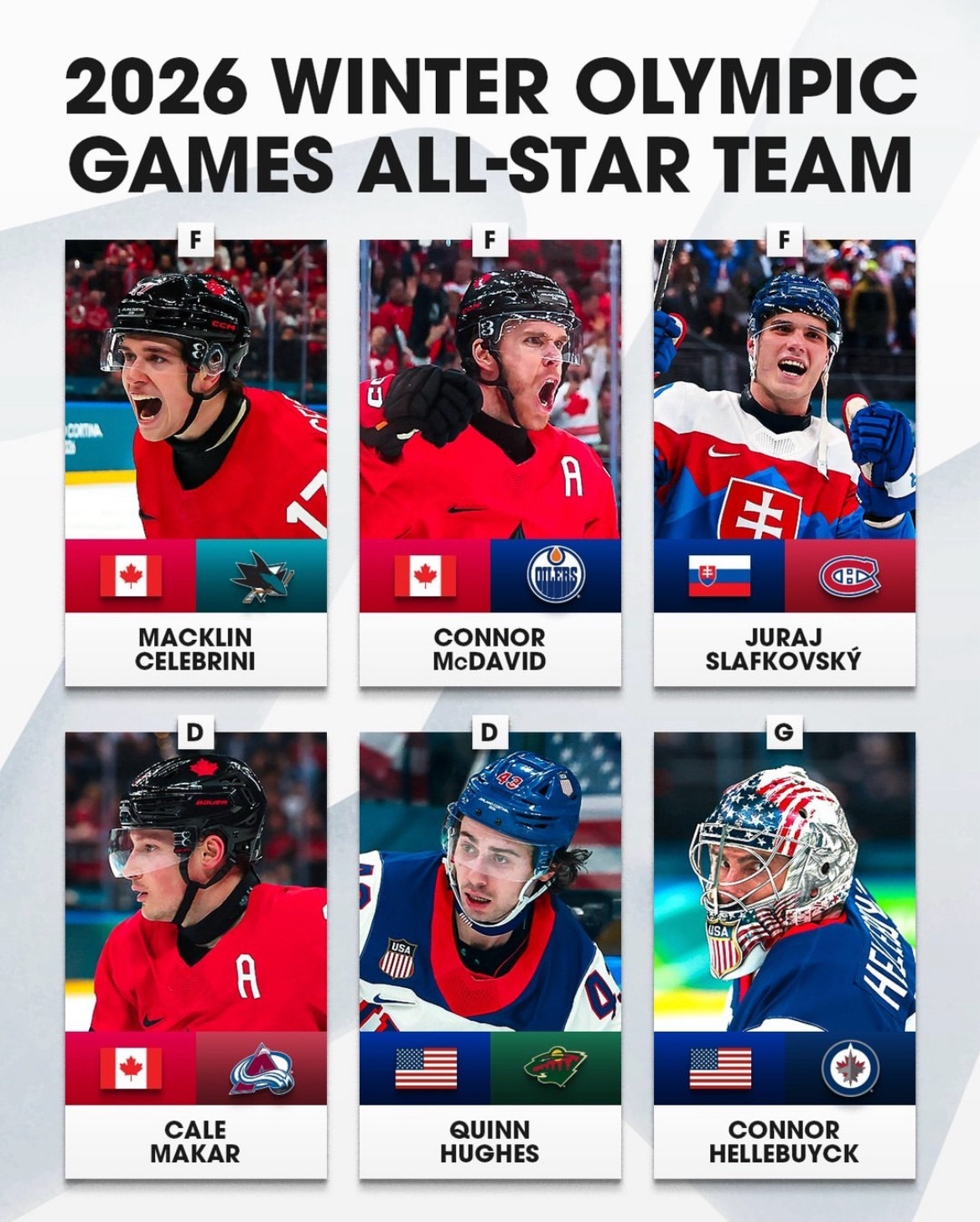 NHL官方发布了2026年米兰-科尔蒂纳冬奥会冰球项目的全明星阵容,这份名单由6名顶尖球员组成,涵盖了前锋、后卫和门将三个位置。