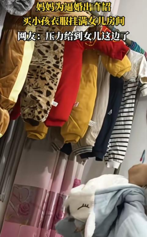 真是服了,为了催婚,可真是出奇招! 一妈妈买了很多小孩的衣服,挂满女儿房间,只为逼女儿结婚。这招真是又温柔又“致命”,表面上不催婚,实则用一屋子小孩默默施压,换谁都招架不住这种情感攻势。 但是结婚是买东西吗?说买就买?东西不合心意可以退可以转卖,但是结婚不幸福怎么办?真正的亲情,不该是沉默的施压,而是彼此理解与尊重。 建议女子给妈妈买一只猫之类的,正好这些衣服也能派上用场,同时还能分散妈妈的注意力,让妈妈忙碌一点。