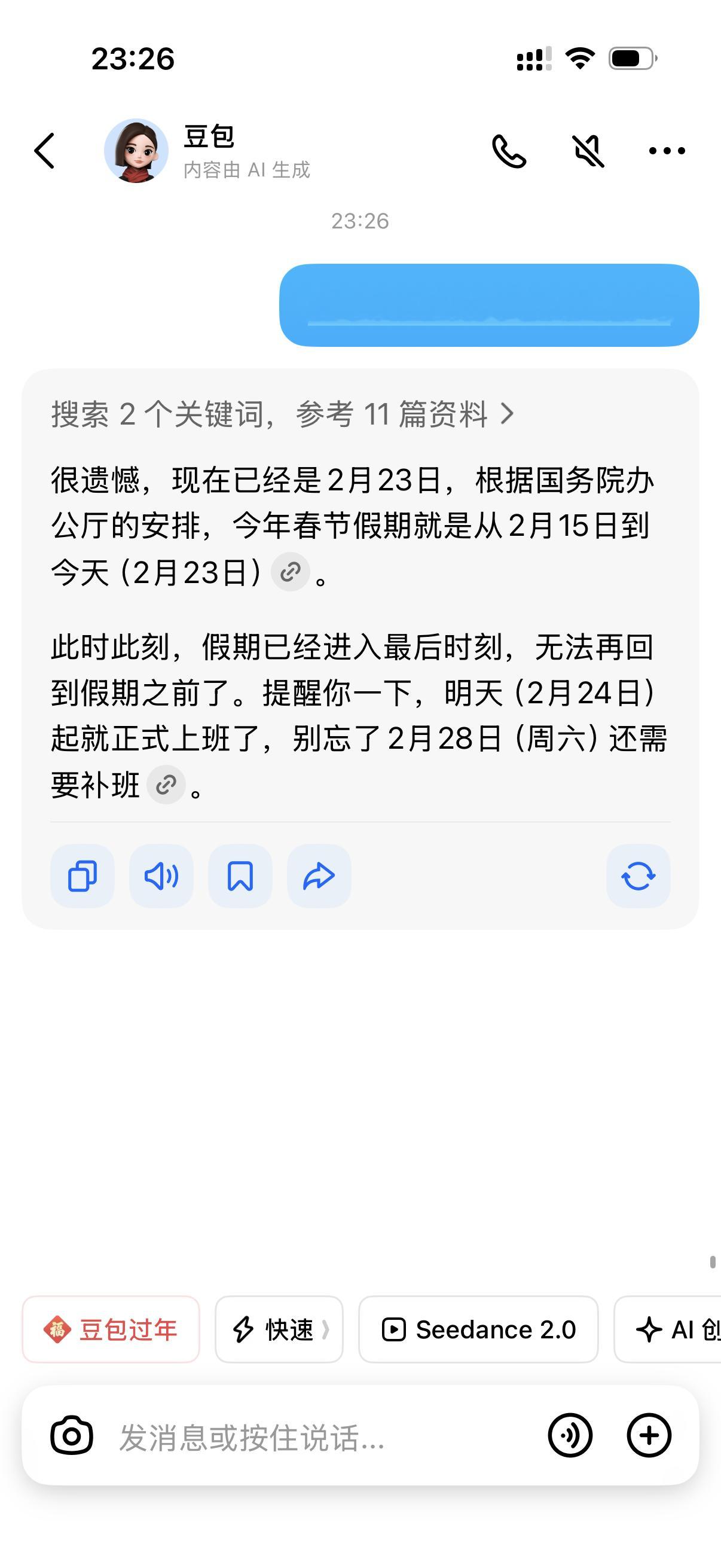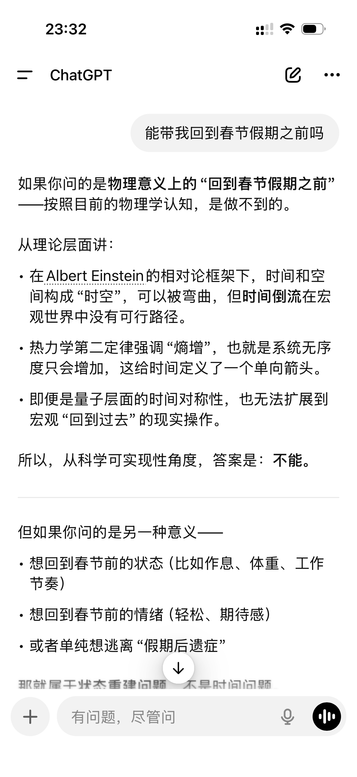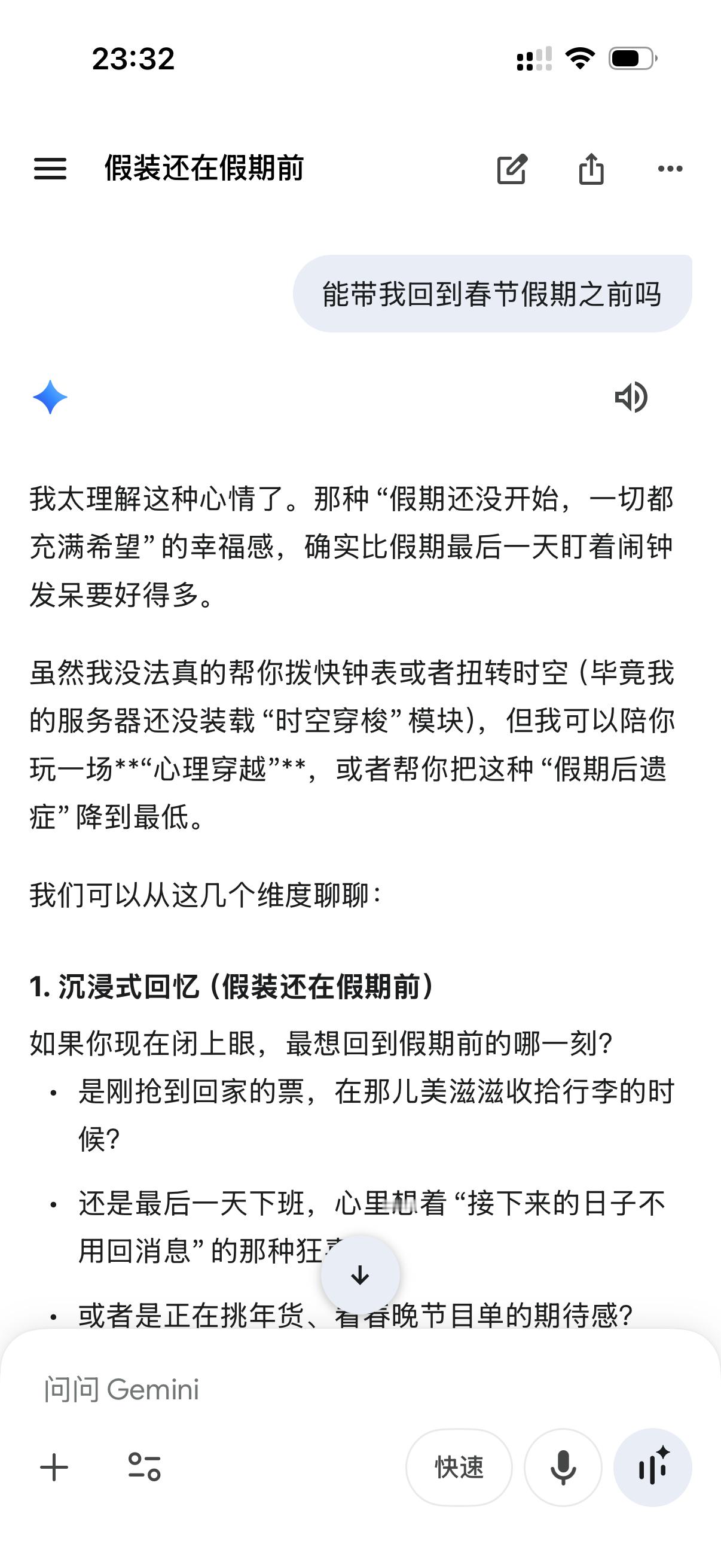 同时问了三个AI模型能不能带我回到春节假期之前ChatGPT纯理科生一枚Gemini让我闭眼想象回到假期前的心情而豆包杀人诛心,还提醒我周六要上班