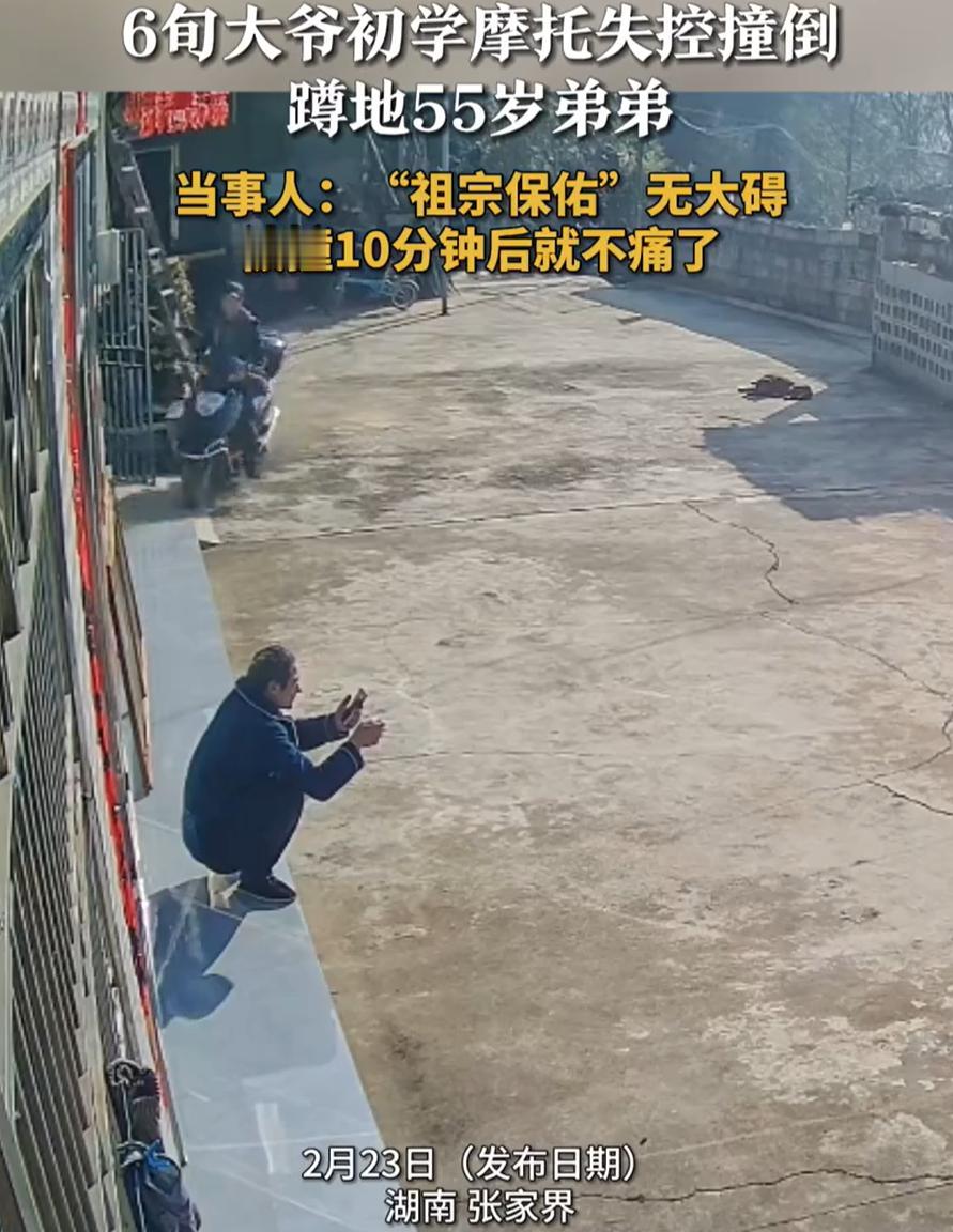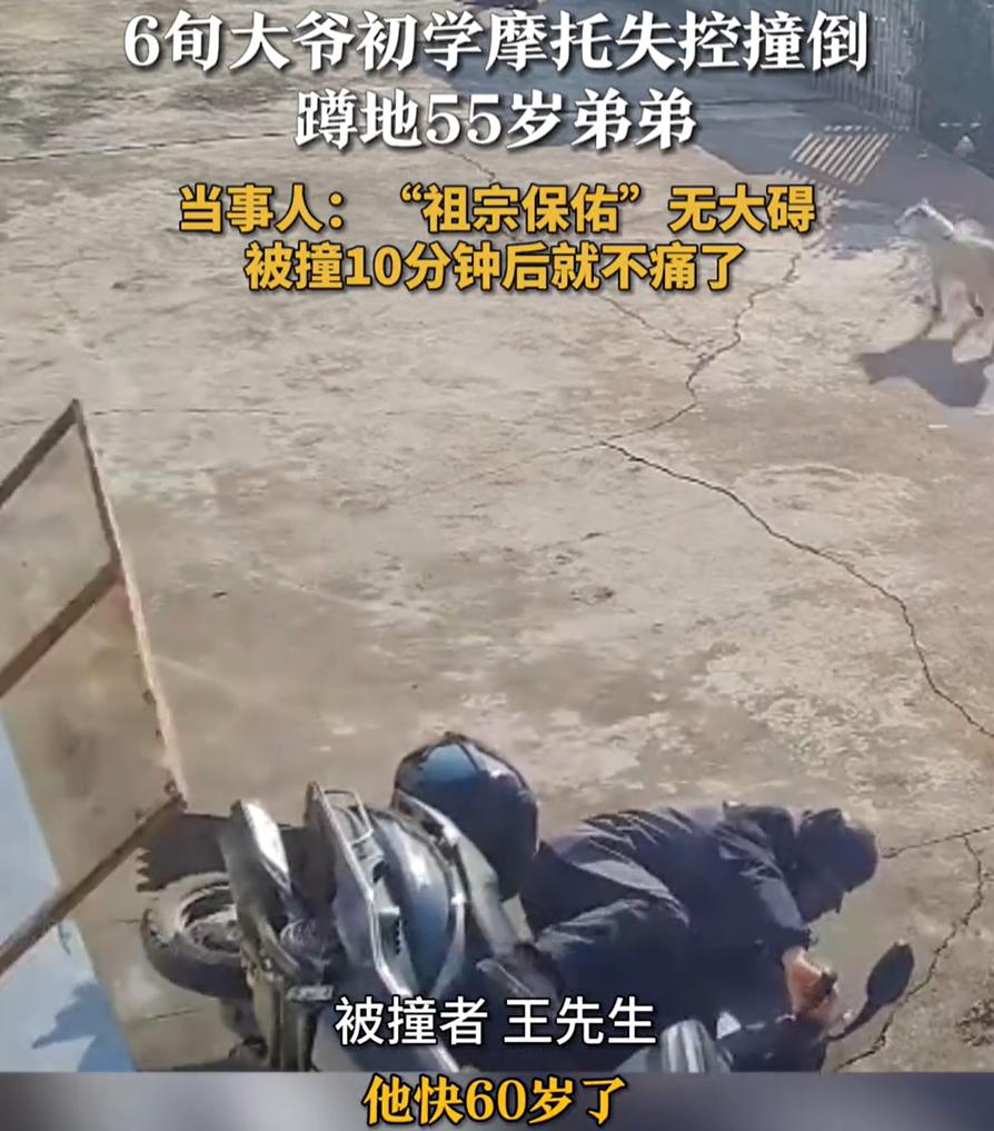 幸亏这是亲兄弟!湖南张家界,55岁男子正蹲在家门口玩手机,没成想,突然一辆摩托车就冲着自己开了过来,而且完全没有刹车的意思,男子当场被撞飞两三米,回过神一看,撞飞自己的不是别人,竟然是亲哥哥 原来,60多岁的哥哥闲着没事干,看到弟弟的摩托车停在院子里,就想着上去开一下,原以为是简简单单,结果上车一拧油门,车是窜出去了,但人却慌了 这摩托车在他手里根本不听使唤,就跟一匹脱缰的野马似的,直直地就冲着门口蹲着的弟弟冲了过去。更要命的是,二哥一紧张,脑子里一片空白,连刹车在哪都给忘了 蹲着的弟弟还没反应过来,就感觉一股大力撞来,整个人被撞飞出去两三米远,手机也甩飞了,估计当时人都懵了。等他回过神,忍着疼一看,撞自己的不是别人,正是自己的亲二哥。这找谁说理去? 万幸的是,弟弟王先生后来自己说,缓了大概十分钟,身上的疼痛感就慢慢消失了,身体没啥大碍。他自己都说,这真是老天保佑 其实想想也是,55岁的人了,被这么撞一下,要换个没血缘关系的陌生人,这事可就大了,轻则赔钱检查,重了还不得闹到派出所去?可正因为是亲兄弟,撞了就撞了,疼也疼了,最后也只能摆摆手,算了算了,自认倒霉 这事儿在网上传开后,网友们也是议论纷纷,都说这真是亲兄弟才有的“特权”。换个人,今天这事没那么容易翻篇。这也从侧面说明,亲情有时候就像一层看不见的保护膜,能化解很多外人眼里的“大事” 这事也给咱们提了个醒,特别是家里有老人的。上了年纪,反应能力和协调能力确实不如从前,对于摩托车、电动车这类有一定操作难度的交通工具,最好还是不要轻易尝试 6旬大爷初学摩托失控撞倒55岁弟弟