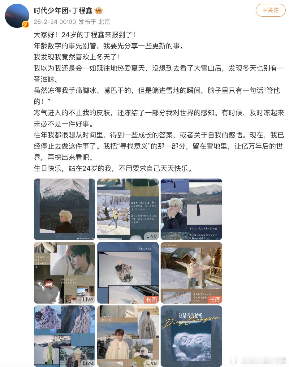 丁程鑫24岁生日文:“生日快乐,站在24岁的我,不用要求自己天天快乐。”
