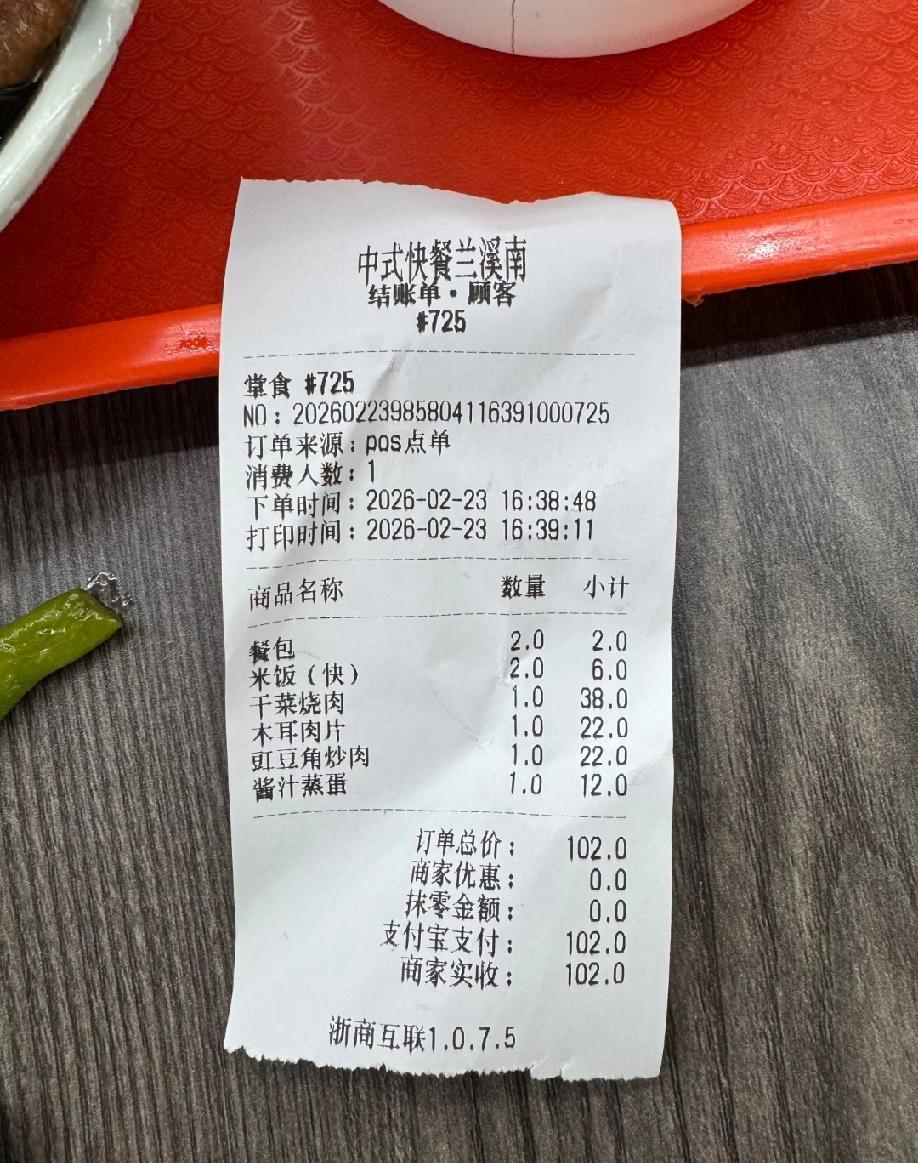 浙江金华,网友发文吐槽:在金华兰溪服务区点了一份快餐,四个菜,给我干了102大洋,这也太贵了吧?是现在的钱都太容易赚了吗? 评论区网友调侃道:我们在高速服务区吃一份泡面都觉得够奢侈了,你居然还敢吃快餐。再说了,这四个菜,放在杭州市区也要七八十,高速服务区收你102大洋,你觉得贵吗?而且还是在这大过年的日子。 更有网友戏谑道:我服务区只敢上厕所! [捂脸][捂脸][捂脸]