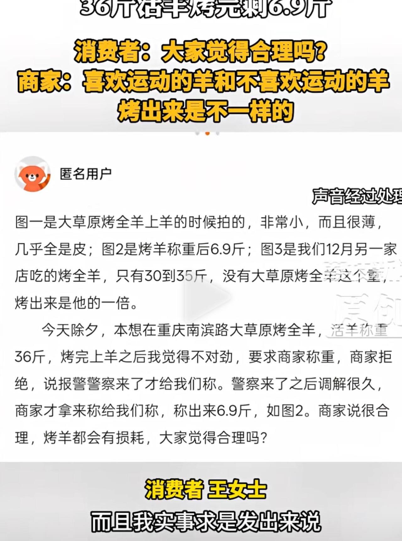 重庆的王女士除夕夜带家人去大草原烤全羊店,花1188元买套餐,挑了只36斤的活羊。等烤好端上来,她傻眼了:羊个头小、肉薄,跟想象中完全不一样。她质疑商家,商家解释活羊屠宰、去皮、放血、去内脏、烧烤后重量会缩水,只剩四成左右。王女士要求当场称重,商家拒绝。 双方吵起来,王女士报警。警察来后,商家才称重,烤羊只剩6.9斤。商家还狡辩,说羊有个体差异,有的爱运动有的不爱,这只羊“喜欢静”,又烤得干,所以缩水多。 王女士不接受这说法,网友也炸了,都觉得商家肯定动了手脚,正常缩水不会这么狠。有人建议,干脆再选只差不多重的活羊,当着大家面走完全流程再称重,如果结果接近6.9斤,就信商家;要是差得多,那就是商家黑心。 要我说,商家这解释太扯了。36斤活羊烤完剩6.9斤,缩水八成,这哪是烤羊,简直是烤没了。还扯什么羊“喜欢静”,当消费者傻啊?明显是缺斤短两,看除夕夜人多就宰客。支持王女士维权,这种店就该曝光,让大家避雷。 你咋看?