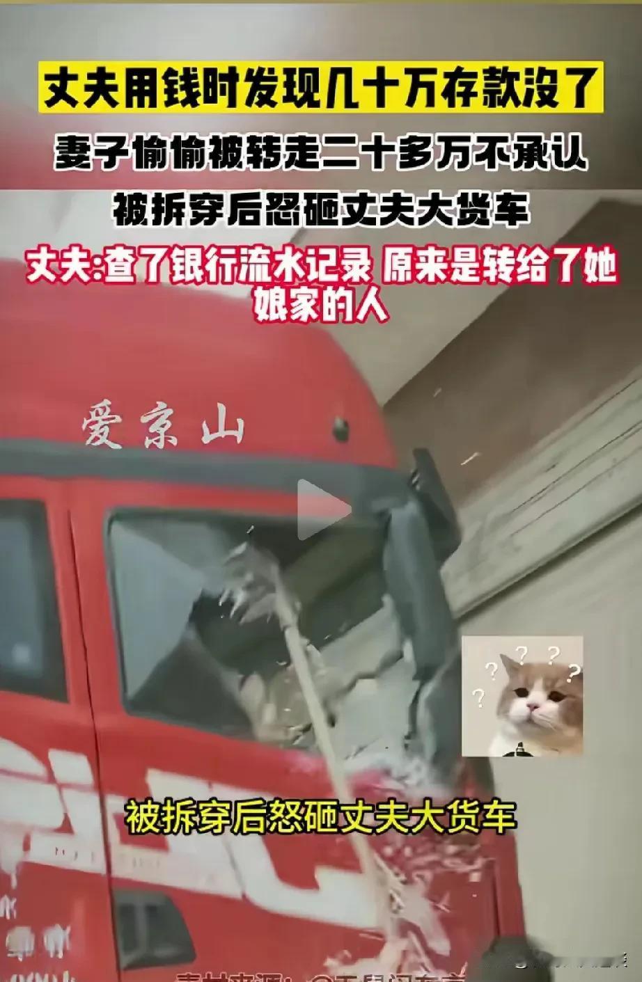 这种女人万万不能再要了,赶紧离婚吧。女人把家里几十万存款偷偷转给弟弟买房用,没有告知老公,她老公要用钱才发现不见了,开始女人不承认,后来被揭穿后,女人恼羞成怒,直接把男人的货车给砸了,这是男人赚钱的工具。 女人一容易冲动,二也不明智,家里的钱属于夫妻的共同财产,你该转给你弟弟买房子用,你为什么不通知你老公,他有权知道。你不该把家里唯一的赚钱工具给砸了,以后日子还过不过了。 很多网友说赶紧离婚吧,这样的女人不能再要了,离婚前先把钱要回来再说。