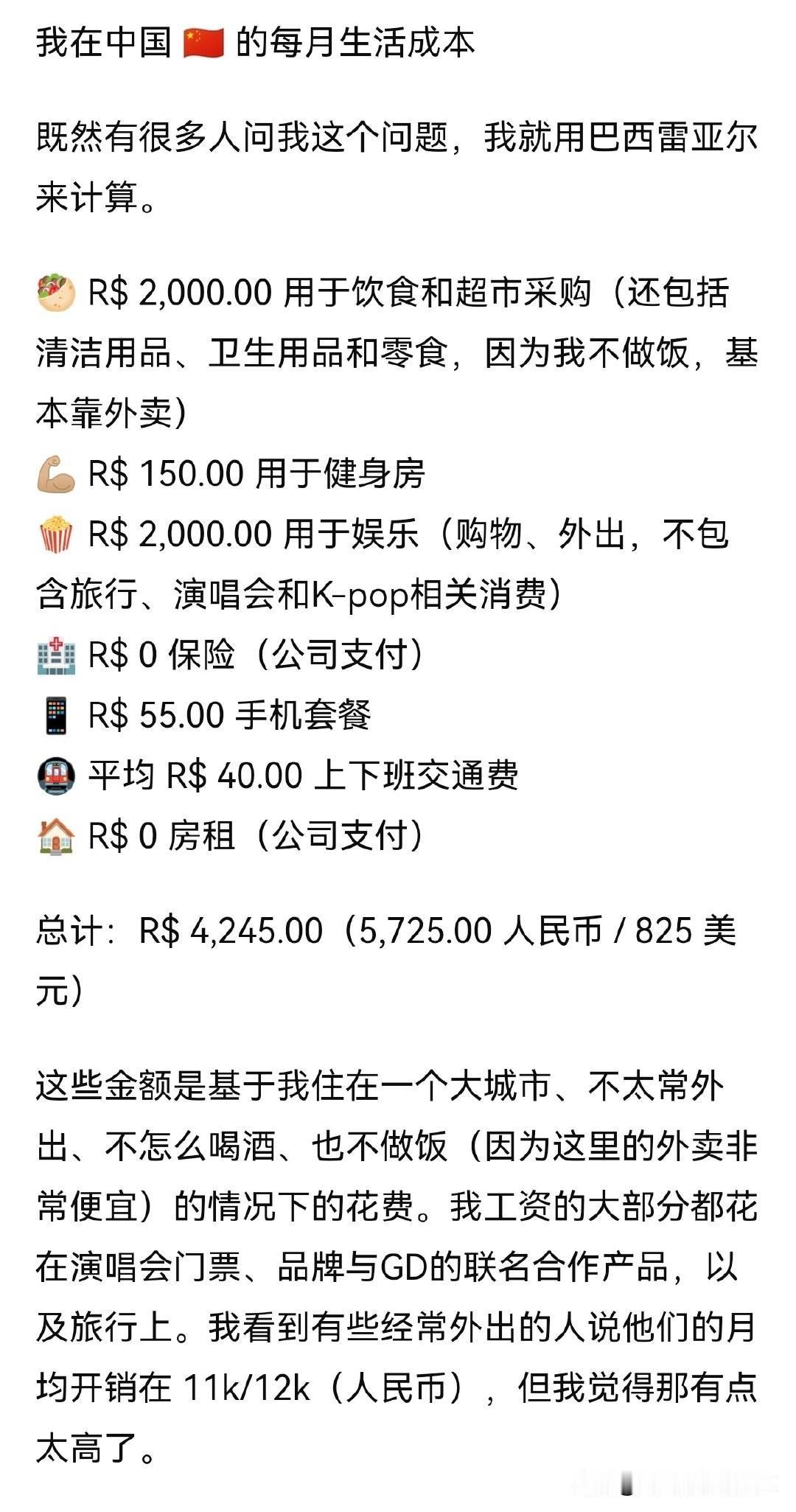 外网上有个很火的话题,是关于世界各地的生活成本的,有个在中国的巴西女生分享了自己在中国的花销——她每个月花5700人民币,只占她工资的1/3,最大的开销是淘宝,家里已经没地方放了!