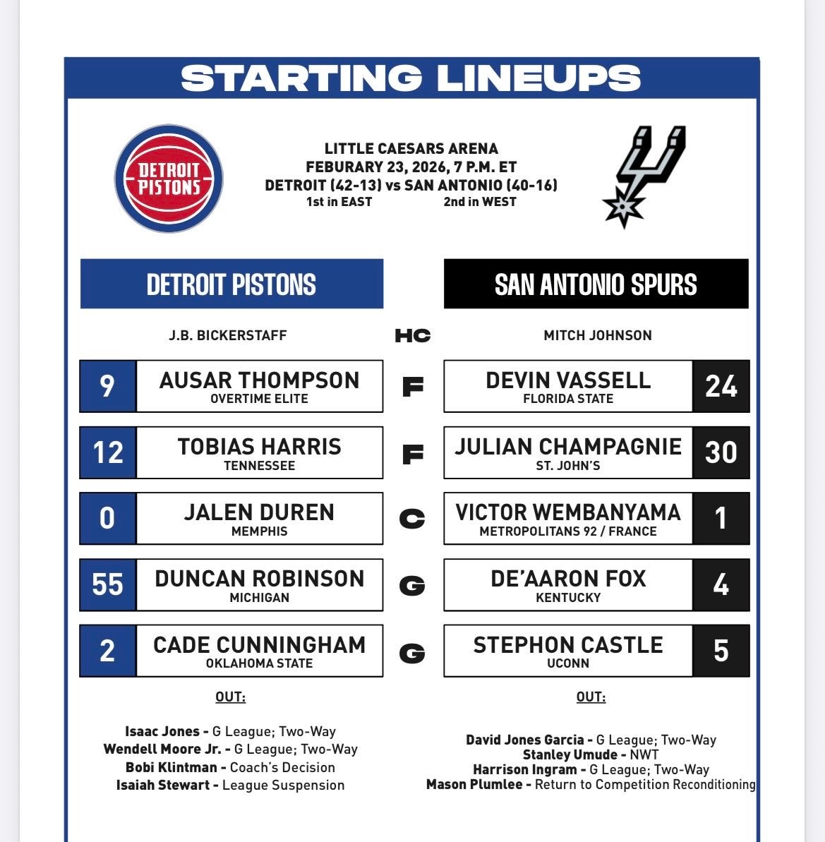 两队首发出炉👇马刺vs活塞