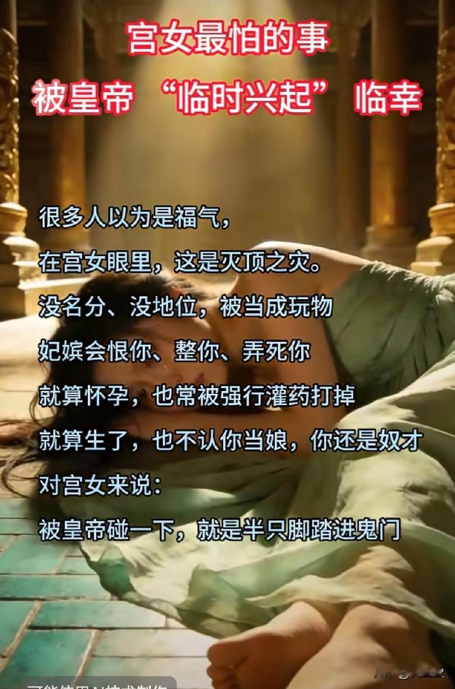 被皇帝 “临时兴起” 临幸 很多人以为是福气! 在宫女眼里,这是灭顶之灾! 宫女最怕的是被皇帝“临时兴起”临幸, 没名分,没地位,被当成玩物, 妃嫔会恨你,会整你,会弄死你。 就算怀孕,也会被强行打掉! 就算生下来,也不认你当娘,你还是奴才。 对宫女来说,被皇帝碰一下,就是半只脚踏进了鬼门关!