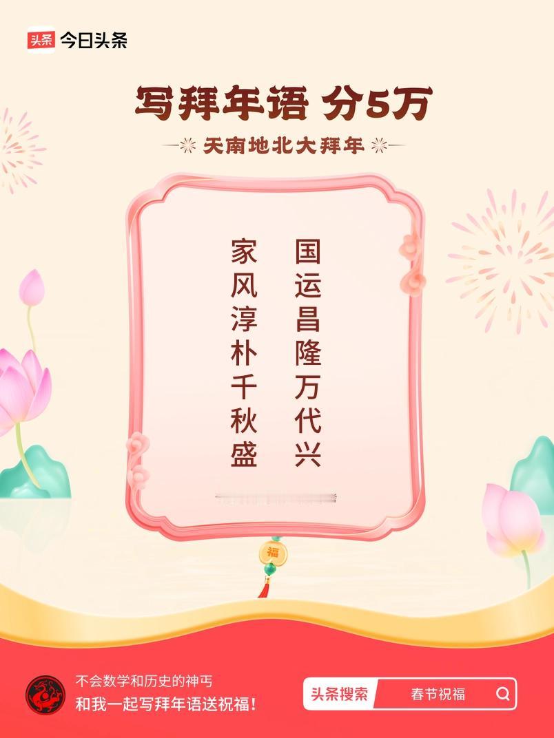 写拜年语送祝福新春拜年送祝福!我的祝福是:“家风淳朴千秋盛,国运昌隆万代兴”!快来一起写祝福吧戳这里,一起领红包>
