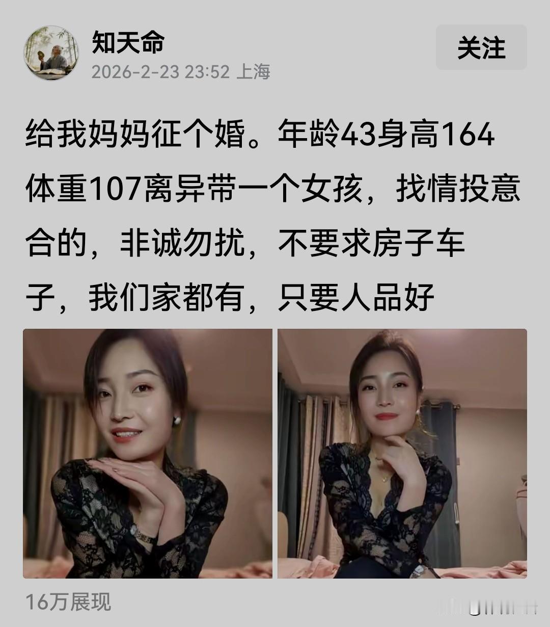 一位上海女孩给自己妈妈写的征婚帖子:年龄43岁,身高164厘米,体重107斤,离异带一个女孩。不要求房子车子,她们家都有,只要人品好就行。 这个征婚帖子是真是假?是以女儿的身份给自己征婚,还是女儿真的为自己亲妈征婚,这个不好说。但是,女子照片的颜值以及不图房子车子的三观,估计会让很多男人倾倒。 是的,男人找离异带孩子的女人,就应该找个带女孩的,女孩长大了是一门亲戚,只要对她好,她也会孝敬你。 男人们要注意,千万不能找带男孩的离异女子,别问为什么?想一想多尔衮就知道了结果。