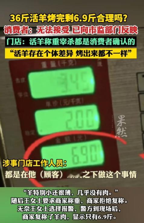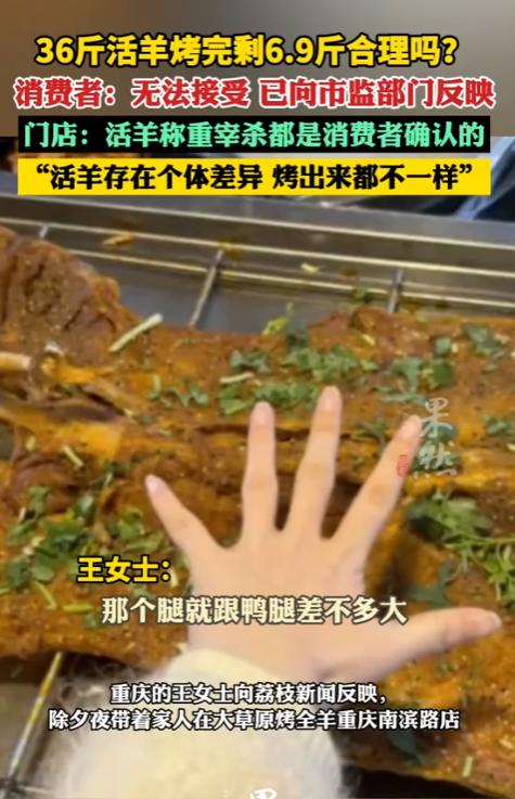 “吃相太难看了!”重庆,女子在除夕夜,带着全家人去一家烤全羊店聚餐,点了1188元的烤全羊套餐。现场称重是36斤,店家还当着王女士的面做了记号。谁知,烤全羊上桌后,女子发现不对劲了,桌上的烤全羊,个头又小又薄,肉干巴巴的,女子怀疑,店家动了手脚,偷梁换柱了。女子要求店家复称,店家说,羊肉烤完本来就会缩水,只剩四成很正常,没必要再称重。女子不能接受这个说法,双方吵了起来。女子一气之下报了警,民警赶到以后,店家被迫复称,结果,这只羊只有6.9斤。店家又说:喜欢运动的羊和不运动的羊,烤出来是不一样的。 除夕夜本是阖家团圆、共享美食的好日子,家家户户都盼着一顿热热闹闹的团圆饭,卸下一整年的疲惫。 可重庆的王女士一家,却在除夕夜的烤全羊店里吃了一肚子委屈,好好的团圆氛围,被一只“缩水严重”的烤全羊搅得支离破碎。 为让家人尽情享受美食,王女士精挑细选,选定了重庆南滨路的大草原烤全羊店。 她精心预订了一份价值1188元的烤全羊套餐,满心期许着能与家人围坐餐桌,共享这难得的佳肴,共度一段温馨美好的用餐时光。 这个价格不算便宜,她本以为能换来一份分量足、味道正的美味,给年夜饭添彩。 王女士一家到店后,店员引领他们至后院选羊,当场挑了一只活羊称重,秤面清晰呈现 36 斤。 店员还在羊腿做了记号,再三强调会现杀现烤,让他们放心,绝无差错。 看着店家诚恳的态度,王女士一家彻底放心,坐下期盼着金黄油亮的烤全羊上桌,可这份期盼,在烤全羊端来的那一刻彻底破碎。 眼前的烤全羊,身形瘦小,可怜至极,其整体单薄,外皮焦黑且易脱落,内里的肉干巴地贴在骨上,能吃的寥寥,与方才那36斤的活羊大相径庭。 王女士察觉异样,首念便是店家偷梁换柱,她即刻唤来店员要求复称,言辞恳切,然而店员却断然拒绝,态度强硬。 店员敷衍解释,羊肉烤完缩水是常态,只剩四成很正常,还说王女士小题大做、不懂行。 王女士难以接纳此说法,36斤的活羊,即便只剩四成,也应有十几斤之重,然而眼前这只羊轻若鸿毛,不足10斤,显然有悖常理。 双方争执越来越激烈,原本热闹的年夜饭氛围被争吵声取代,王女士又气又委屈,争执半个多小时后,她忍无可忍拨打了110报警,希望民警主持公道。 民警赶到后,询问情况、查看记录,要求店家必须复称。 在民警的监督之下,店家满脸不情愿地把烤全羊放上秤,待秤面数值稳定,众人皆惊愕不已——这烤全羊竟仅有6.9斤。 36斤活羊烤完只剩6.9斤,缩水率超80%,即便民警也觉得离谱。 可店家仍不承认掉包,反而想出荒唐理由:活羊有个体差异,喜欢运动的羊肌肉紧实、水分少,烤完缩水更严重,再加上烤得较干,重量轻很正常。 这个“神逻辑”彻底激怒了王女士,事情曝光后也引发网友热议。 网友纷纷吐槽店家荒唐,有网友算账称,36斤活羊宰杀后去掉杂质应剩18斤左右,烤完最少也该有9斤,6.9斤远低于正常范围。 还有网友猜测,店家大概率用瘦小的冷冻羊掉包了活羊,称重和记号只是迷惑消费者的手段; 更有网友算出,1188元买6.9斤烤全羊,折合每斤171元,比进口牛排还贵,堪称“天价”。 其实王女士的遭遇并非个例,近年来烤全羊行业“活羊称重、成品缩水”的投诉屡见不鲜,商家常利用消费者无法全程监督的漏洞赚黑心钱。 从法律层面看,店家承诺用36斤活羊却提供重量严重不符的成品,涉嫌隐瞒分量、误导消费者,若查实掉包,就构成消费欺诈。 截至2月23日,王女士此前向市场监管部门发起的投诉正等待调解。 1188元买的不仅是烤全羊,更是消费者对商家的信任,店家的行为,不仅损害了王女士的合法权益,更消耗了整个烤全羊行业乃至餐饮行业的公信力。