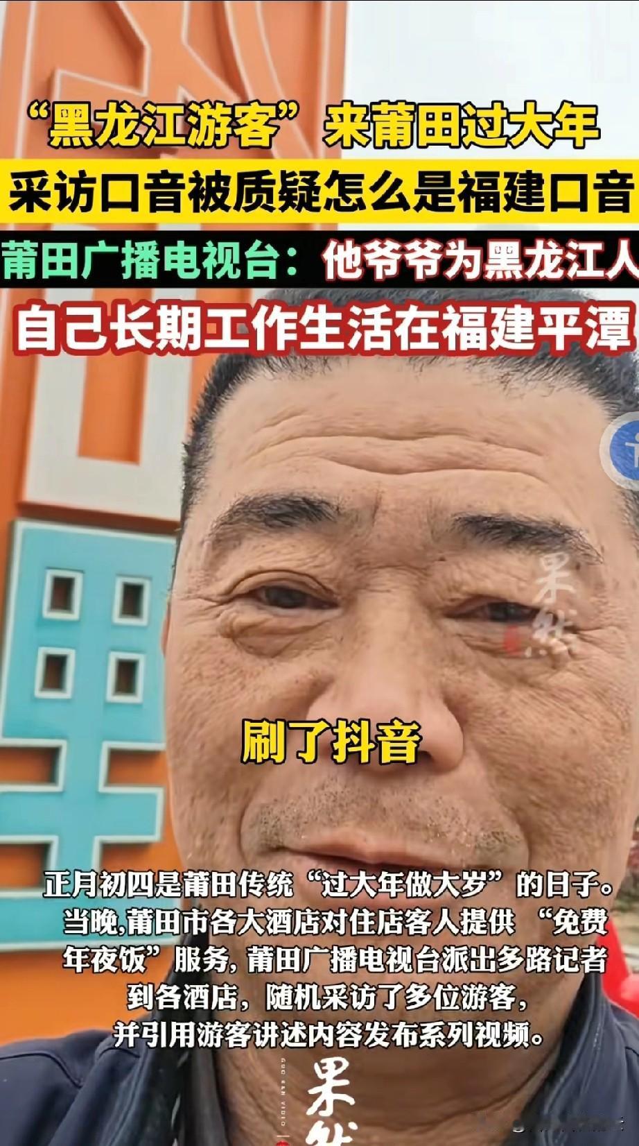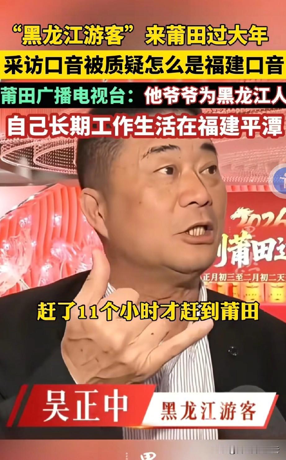 网友真是火眼金睛,福建莆田过年搞活动,来莆田过大年住酒店免费。记者去酒店采访游客时,采访到一位自称来自黑龙江的吴先生,吴先生说他是刷到小视频看到这个活动的,专门坐了11个小时的飞机过来。 没想到吴先生一嘴的福建普通话让网友质疑,有网友说我们黑龙江人可不这样说话,管飞机叫灰机。 也有网友质疑这是电视台作假,让本地人装外地游客。 电视台说联系了吴先生,得到的回应是,吴先生的爷爷是黑龙江人,他现在长期在福建平潭生活。 可是这个解释显然不能打消网友的疑虑,吴先生说坐飞机11个小时到的,可福建平潭到莆田需要坐飞机11小时飞机吗?福建到底有多大啊? 其实说一个谎话就要用一百个谎话来圆,以后还是实事求是的好,别把观众当傻子。 对于这件事,你怎么看呢?