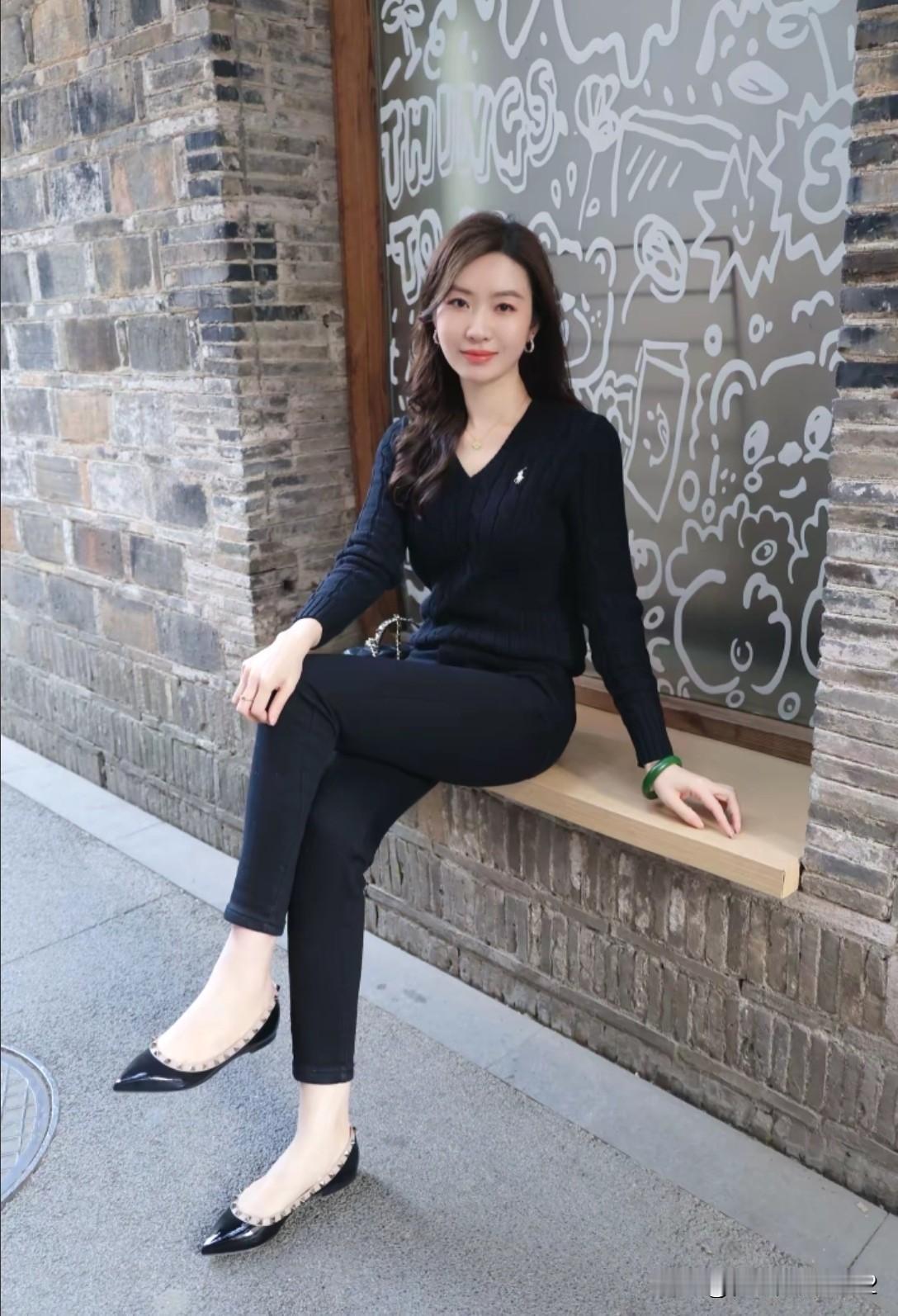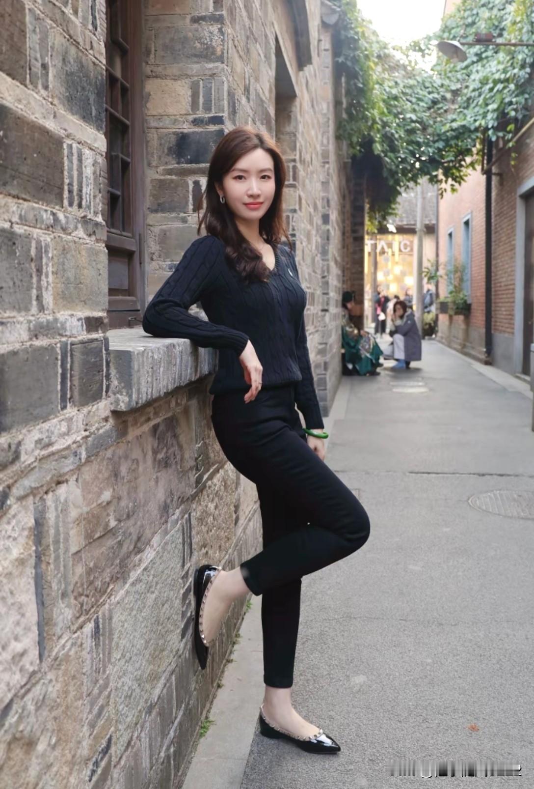黑衣女子倚墙而立,优雅气质扑面而来