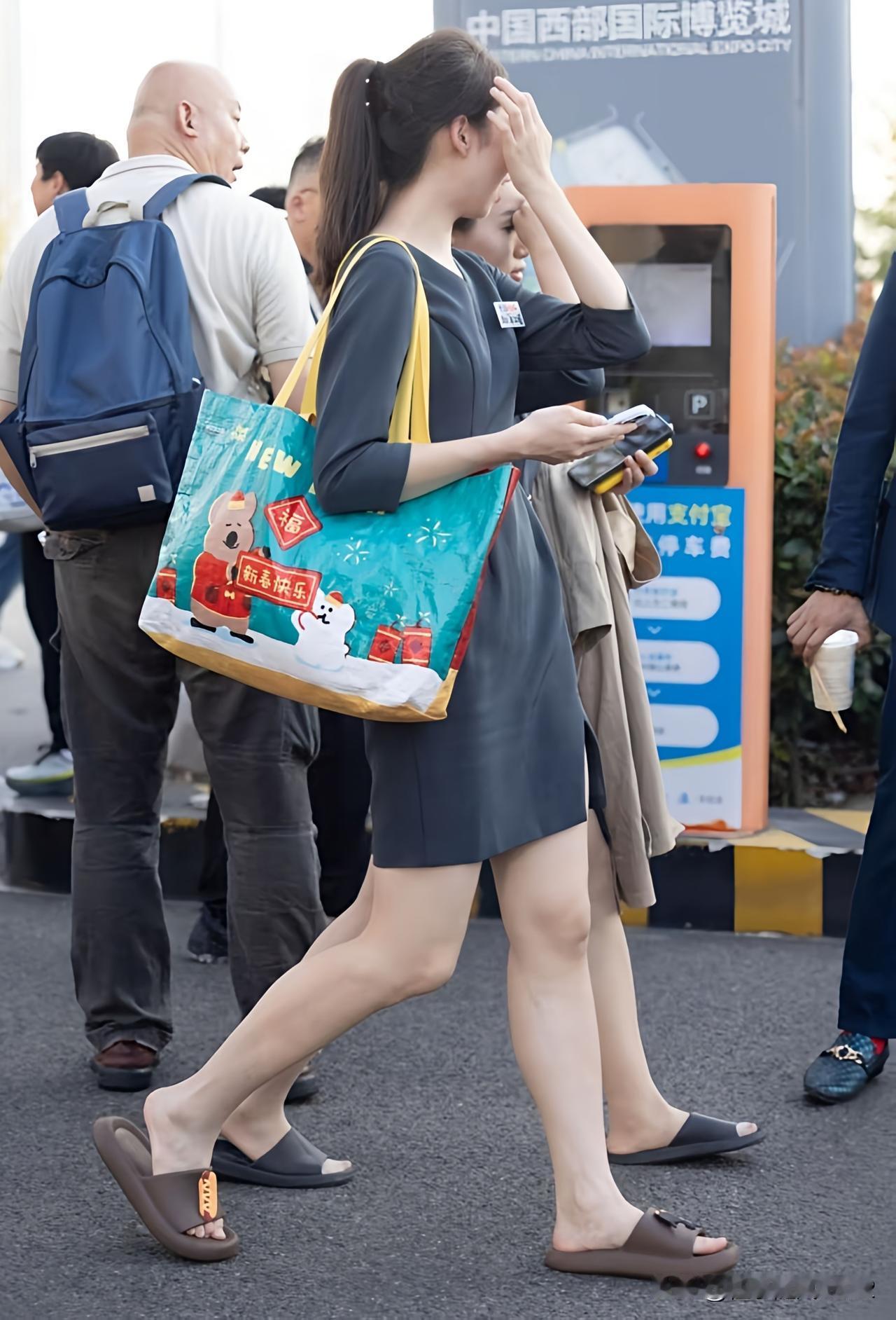 优雅车展现场,蓝色连衣裙搭配高跟鞋,尽显时尚魅力