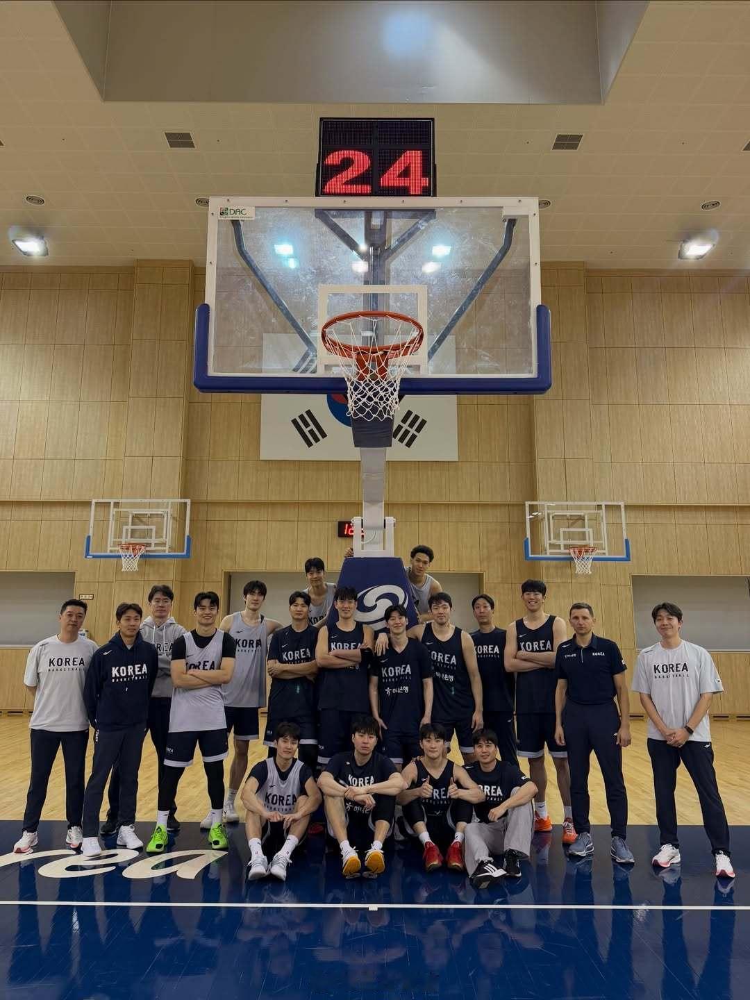 韩国男篮23日训练后合照,他们今天飞往中国台湾省,准备26日的比赛。