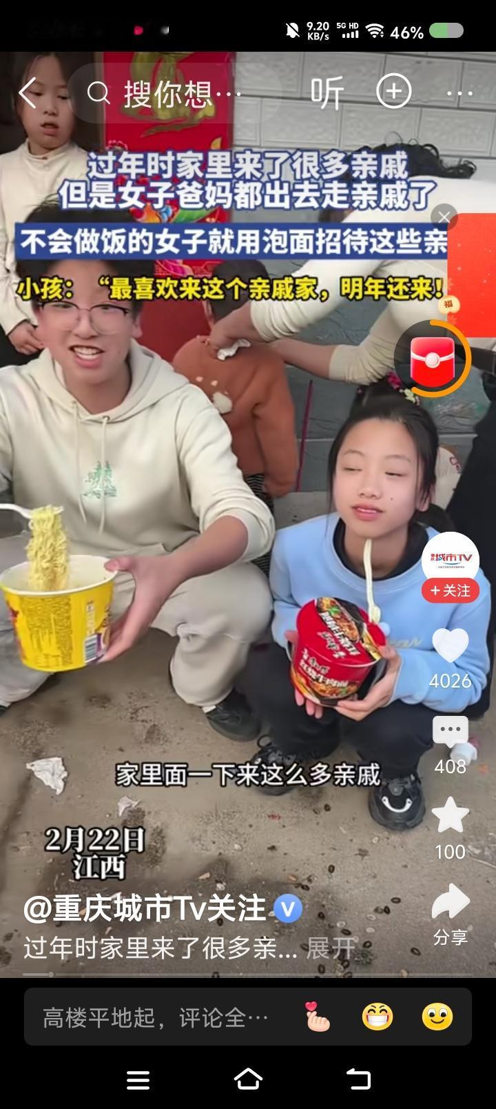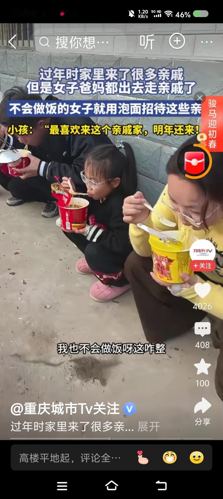 楚云飞,炮弹已寄出!请挨炮—— 据报道,某地拜年,主人出门了,女孩在家。女孩只好拿方便面待客。 点评: 来山西。 山西吃席,先上八个凉菜。 过年,备几个凉菜也好。再弄一两个热菜,可以随时热。比如我这边,喜欢芹菜蒸肉。年前蒸好了。 再烧点米汤。这不就齐了。 楚云飞,上不了台面牌炮弹已发送,你要焚香沐浴,吃我一炮。