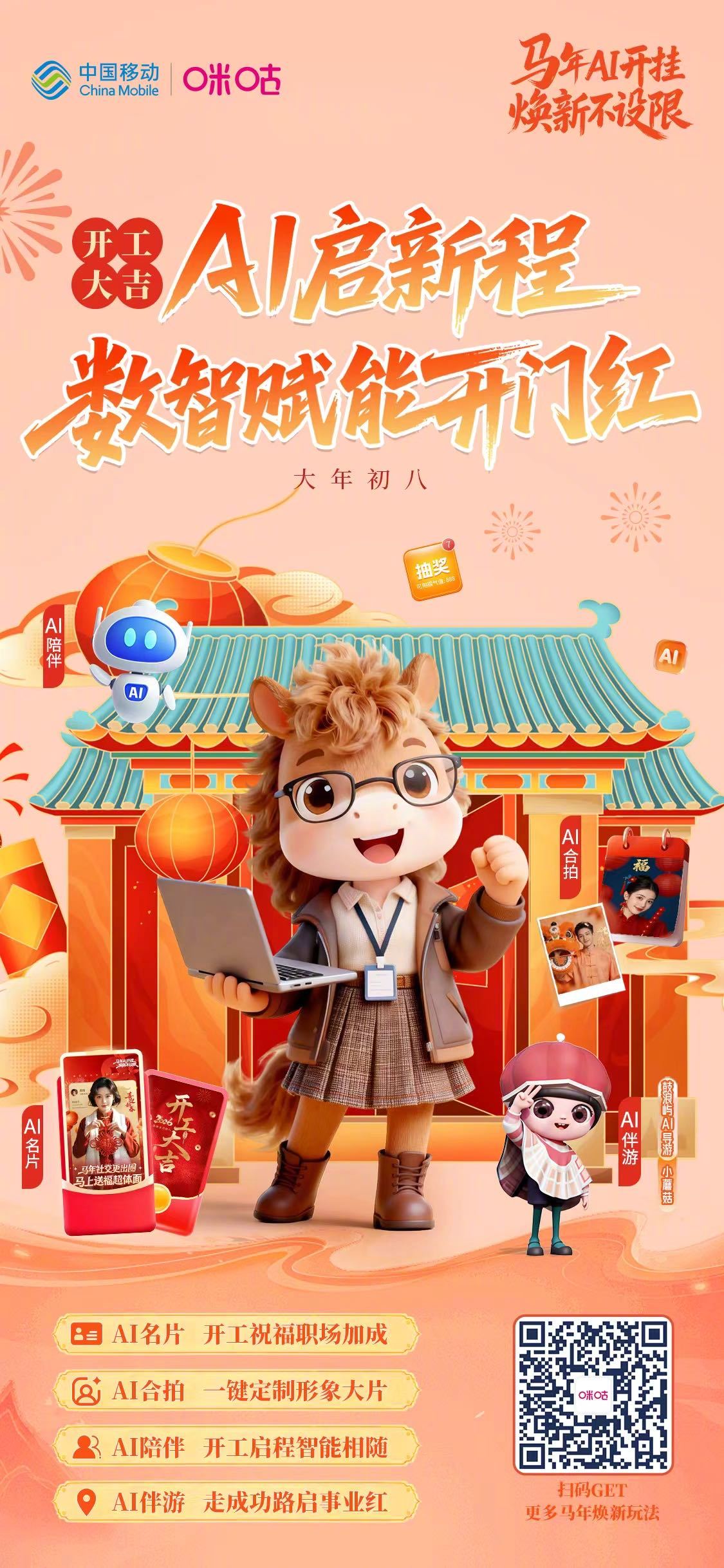 #马年AI开挂焕新不设限# 大年初八开工大吉!中国移动咪咕助力开门红~ AI 名片定制专属开工祝福,发给客户超有面,职场buff叠满;AI合拍一键定制形象大片,开工亮相气场全开;AI陪伴开启新年对话,智能互动共赴新程,开工再启新篇章;AI 伴游“成功之路”好运加持,事业一路开挂~ 扫码解锁数智开工秘籍,马年事业节节高!#2026来鼓浪屿把成功带回家#网页链接